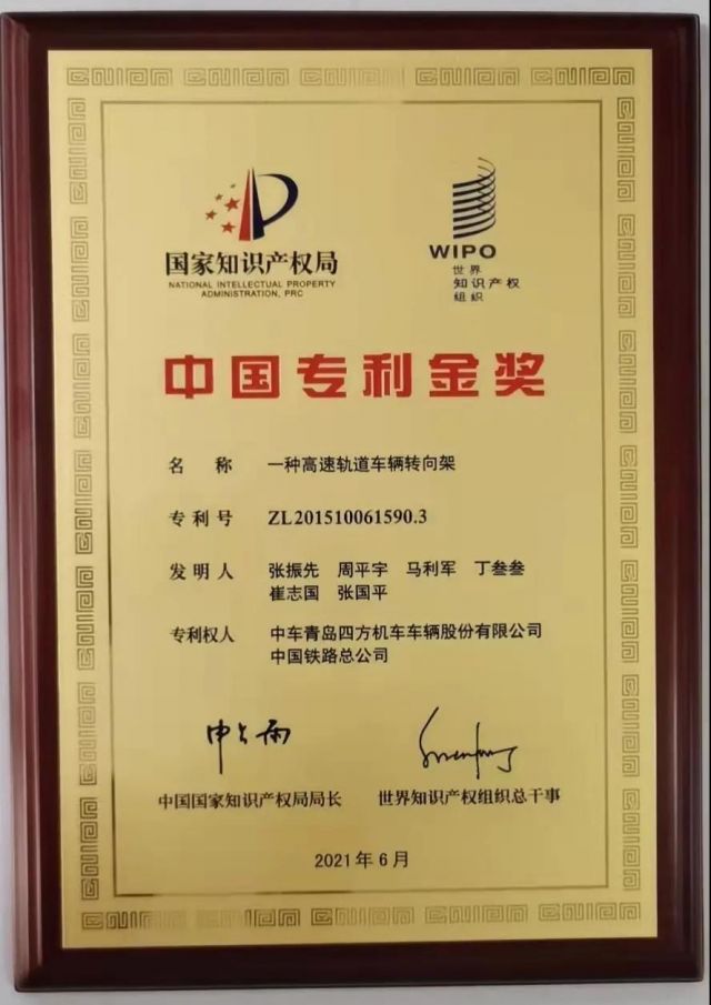 “一种高速轨道车辆转向架”专利摘得中国专利金奖。