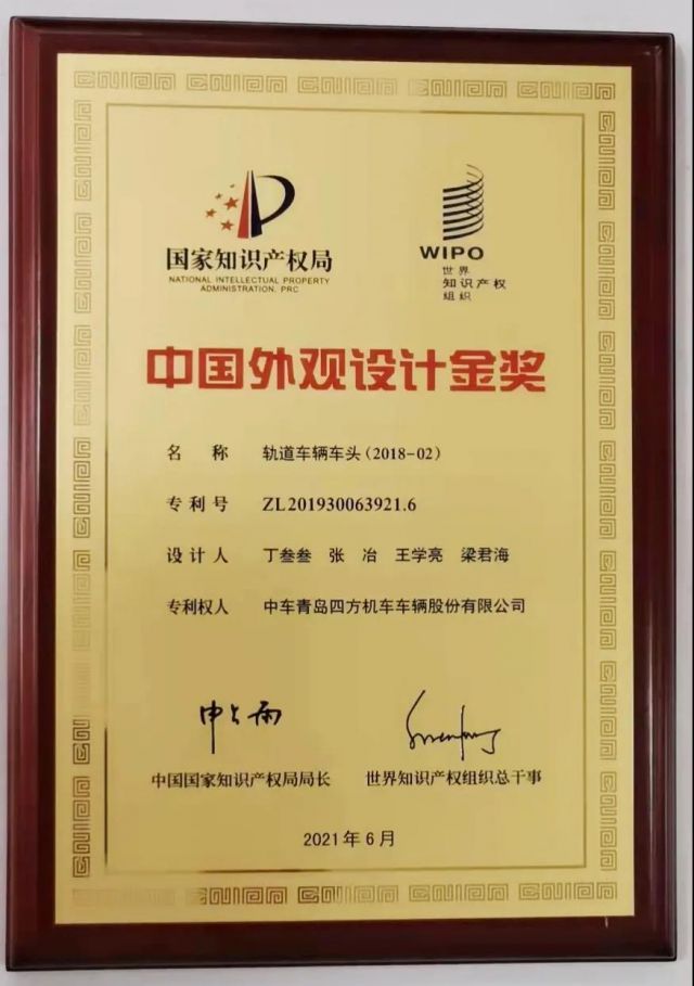应用于北京大兴机场线市域列车的“轨道车辆车头(2018-02)”专利,捧得中国外观设计金奖。