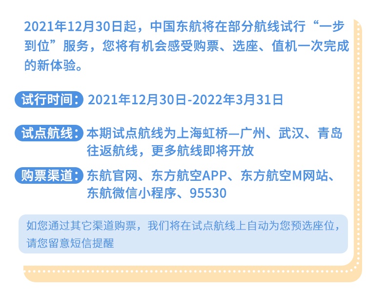 A:如您通过其它购票渠道购买试点航线机票,我们将自动为您预选座位,并通过短信告知,如需更换座位和值机,可至东航官方“选座值机”入口办理;非试点航线购票流程暂不变。