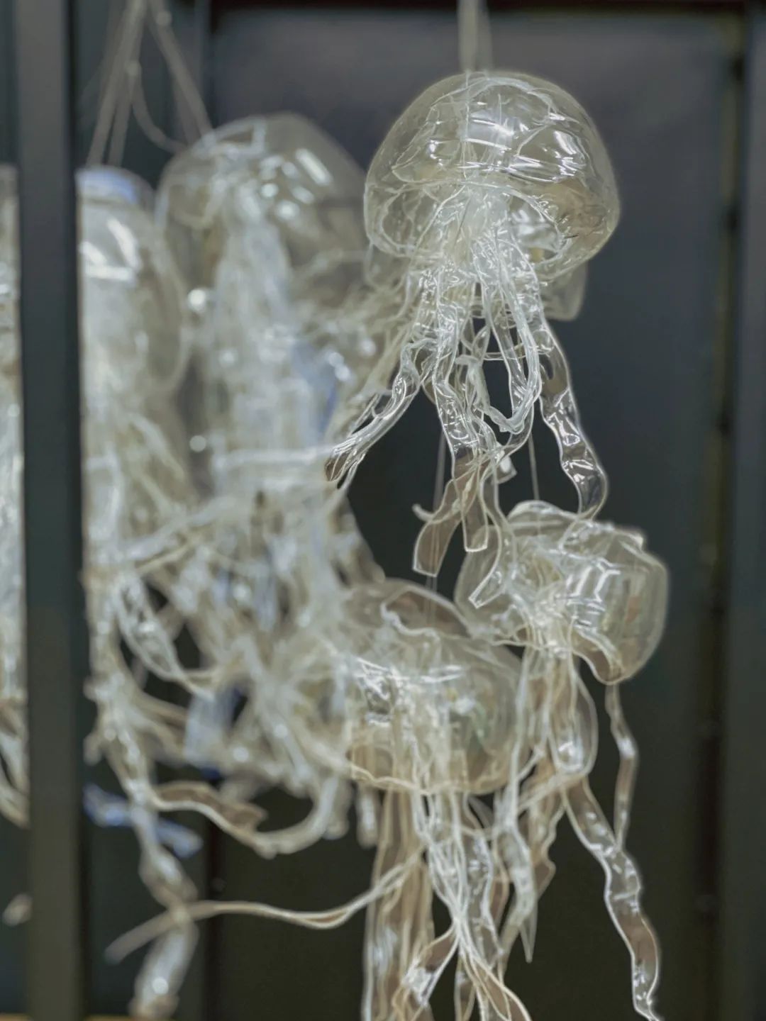海洋产出了地球一半的氧气,但水母大多存活于死水区,生命极度顽强,几乎不需要氧气。随着海水污染的严重,一些海洋生物缺氧而死,水母却因不需要氧气开始繁盛。水母的大量出现,是海洋环境恶化的象征。由塑料拼接而成的水母是海洋污染的具象表现,同时也象征着那些逐渐被塑料入侵、终身携带塑料的海洋生物。大量水母艺术装置的通透感象征着海洋生物的鲜活,但塑料材质又透露出海洋生物的脆弱与逝去的悲哀,让观者反思人类最为日常的塑料垃圾对自然和生物的影响之大。