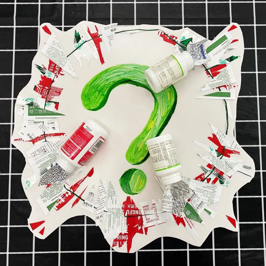 用废弃药瓶与塑料包装做成的老年人用药问题宣传板,关注老年人的用药困惑。在日常生活中,老年人视力不好,说明书字小,造成阅读困难。而宣传板配合学生设计的输入药品自动播报药品说明的科技交互装置,引起大家对老年人用药安全的重视,充满人文关怀。