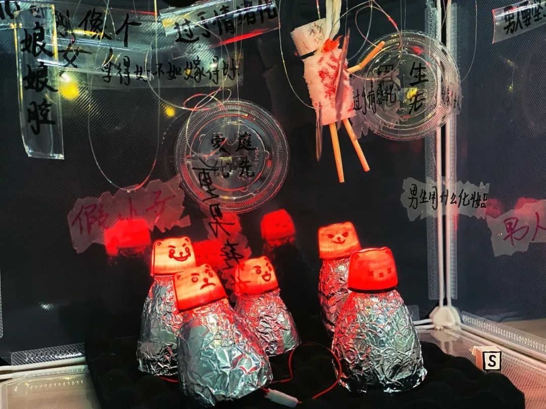网络暴力,污染着网络舆论空间。以“抵制网络暴力 打破刻板印象”为主题的舆论影子小舞台,是一件重在表达的作品。它由废弃咖啡包装、锡纸、塑料包装制作而成,上演一幕幕每天发生在网上的“口水战”。作者希望用这种装置艺术的方式,呼吁在网络世界中理性评价、情绪平和,保持心中的良善与敬畏。