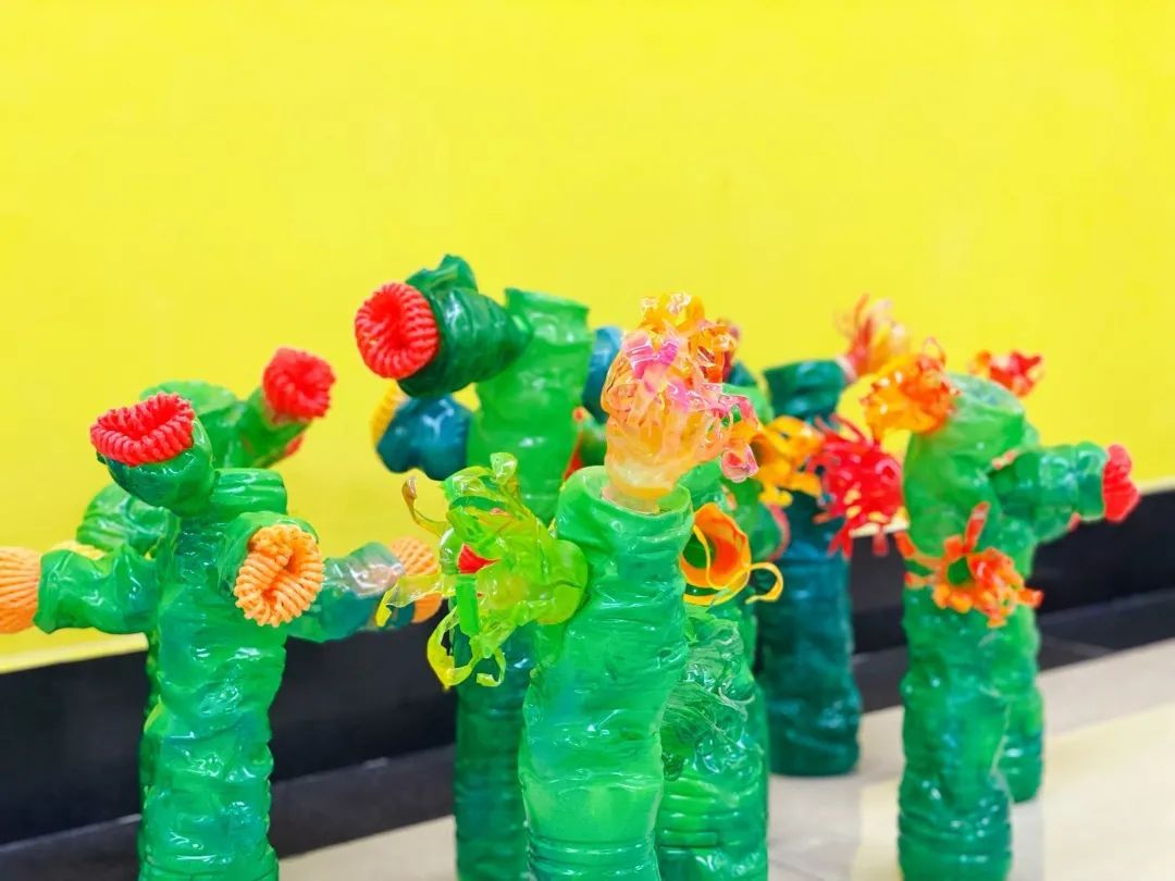 这些作品均由控江中学文创中心开发的为期一学期的《废弃物再生设计》文创导航课程孵化,围绕塑料废弃物再造议题展开,通过讲解设计思维、调研方法、杨浦滨江沿线改造、皂梦空间与白七咖啡馆参观介绍,由控江中学高中生与控江教育集团初中生组成跨学段小组进行实践,将废弃塑料包装、咖啡杯、饮用水瓶制作成艺术装置。