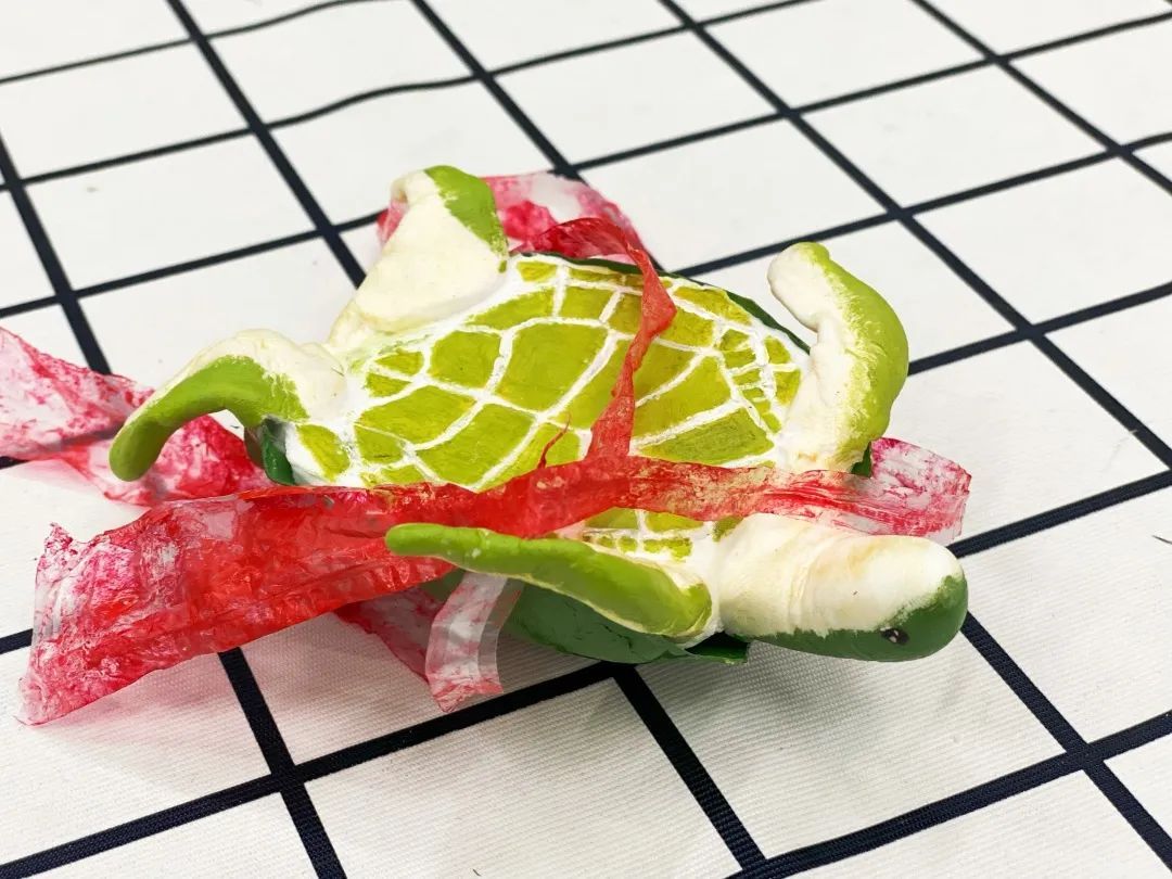同样关注海洋问题的,还有这件小型的雕塑“摇摇欲坠的海龟”。通过塑料制成的海龟壳,还原那些因为塑料污染而终结生命的海洋动物们。微小的雕塑配合触目惊心的海洋污染致死动物的照片,提醒我们不要随意丢弃垃圾。