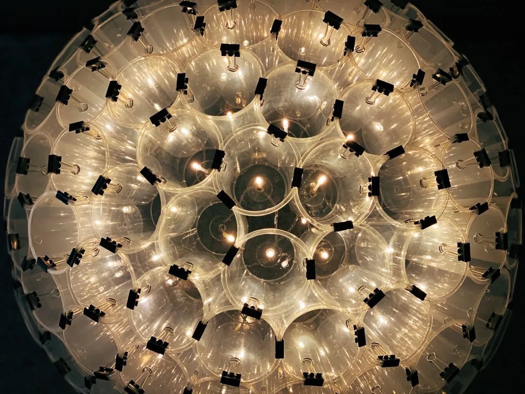 这款泡泡呼吸灯,所有塑料杯均来自杨浦滨江白七咖啡馆的废弃咖啡杯。同学们通过半年的收集与清洗,对其进行打孔、连接,在造型设计上既模仿皂梦空间泡泡元素,又仿佛一个充满生命力的细胞。