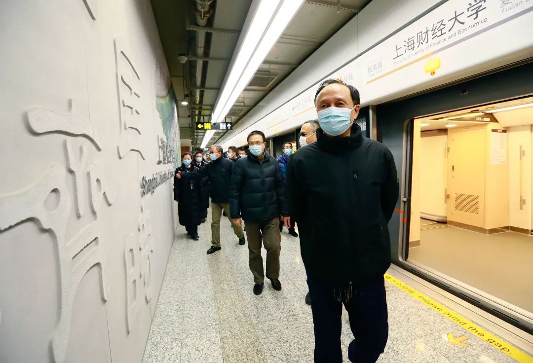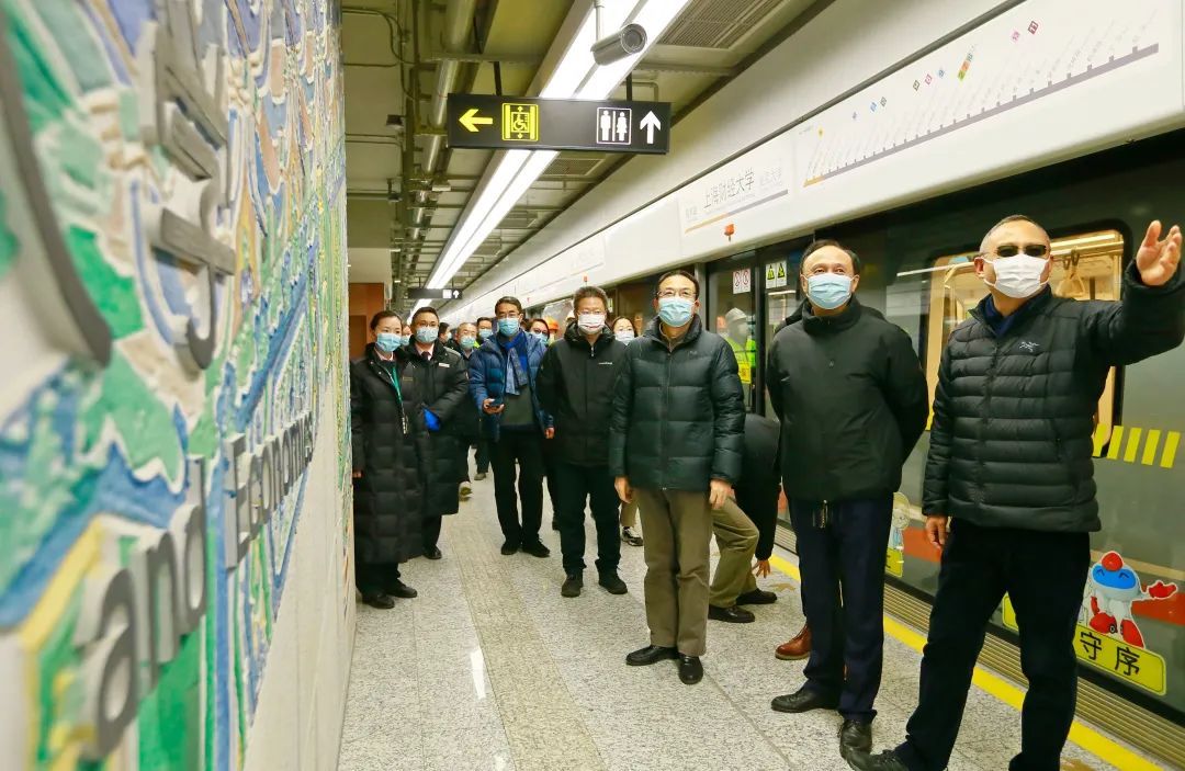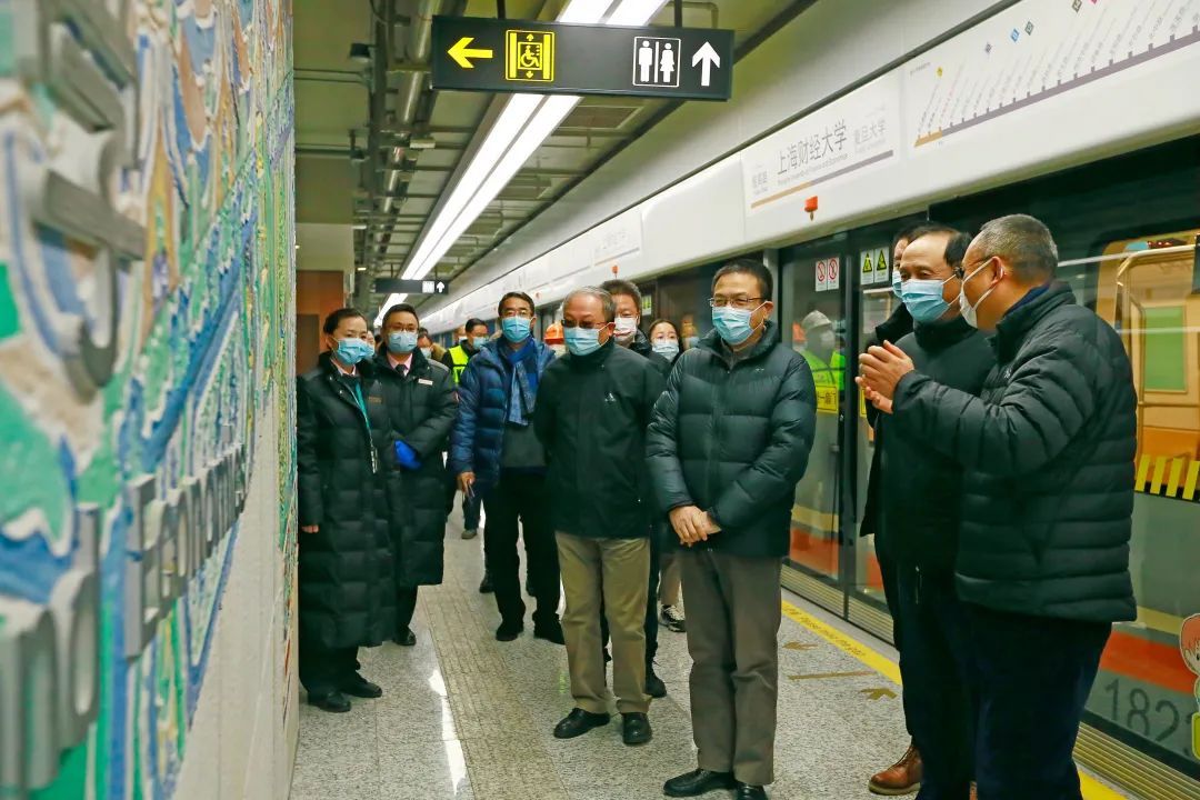 校领导听取项目整体情况的介绍,来到运营中的上海财经大学站站厅、站台,实地查看站名墙。许涛书记赞扬了上财站的整体风格,与上海财经大学文化巧妙融合,特别是站名墙具有浓厚的文化底蕴。