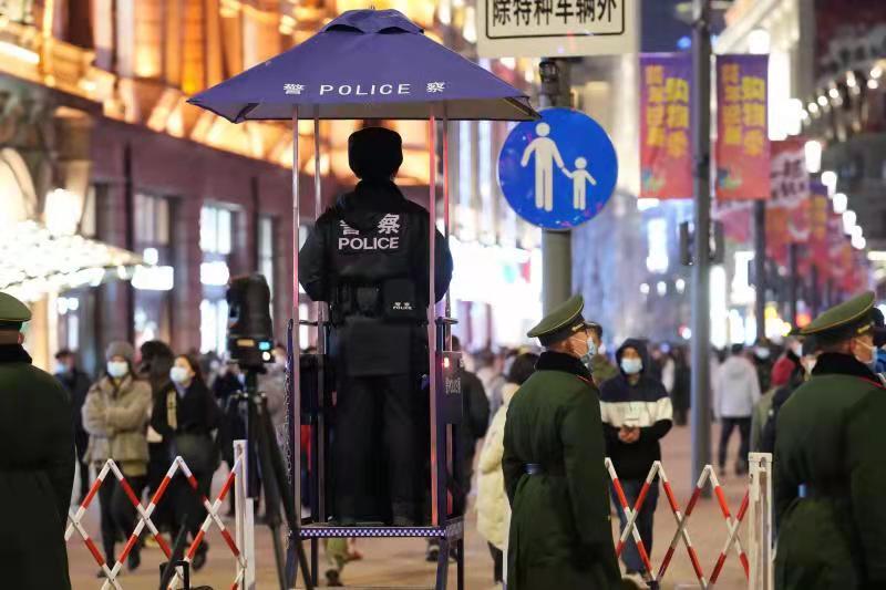 结合超大城市安全运行实际需要和中心城区辖区特点,跨年期间,黄浦警方最大限度地屯兵街面,深化运用多警种融合作战一体化工作机制,加强统筹指挥调度,做好节日安保、社会面防控和突发情况应急处置工作。警方投入7300余名安保力量用以加强重点部位警力投放,加强对旅游景点、商业中心等人员密集场所的安全防护措施。