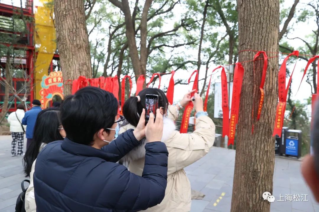 登上山顶后,游客们在新年愿望展板上写下了对2022年的希望,还有人在树上系上写着祝福语的红丝带。佘山国家旅游度假区的志愿者们,贴心地为游客们准备了免费的姜茶。