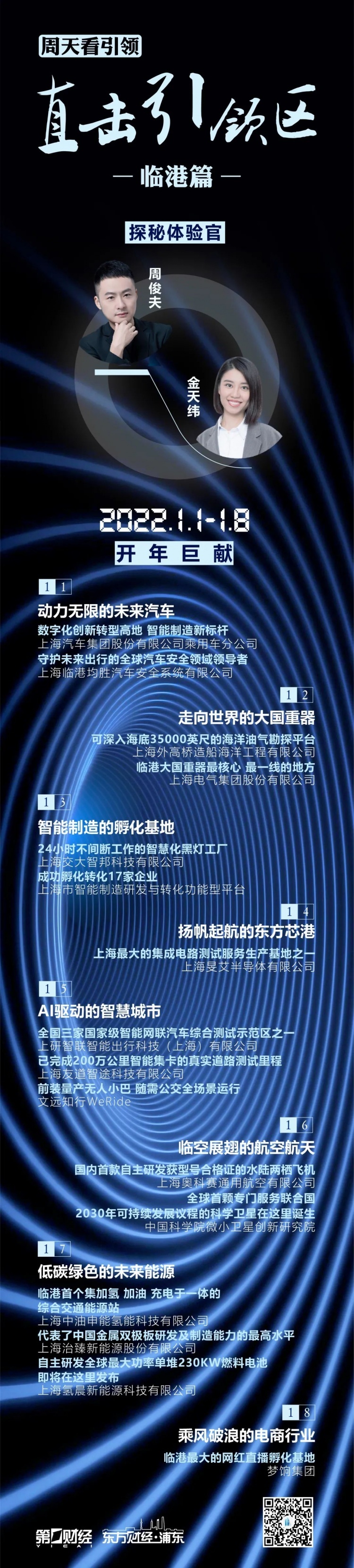 迎接新起点,第一财经、东方财经·浦东频道联袂推出开年大戏,将目光聚焦上海陆域迎接第一缕阳光的地方,浦东引领区和自贸区临港新片区两大国家战略的交汇区——临港新片区,重磅推出直击引领区·临港篇系列短视频,打造“动力无限的未来汽车”“走向世界的大国重器”“智能制造的孵化基地”“扬帆起航的东方芯港”“AI驱动的智慧城市”“临空展翅的航空航天”“低碳绿色的未来能源”“乘风破浪的电商行业”8集优质内容,跟随探秘体验官小周、小天,一同探访上汽、上海电气、中科院微小卫星创新研究院、外高桥海工、交大智邦、旻艾半导体、奥科赛通用航空、氢晨科技等临港近20家企业,领略极速发展和正在崛起的临港。