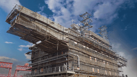 下午13:30,小天来到了码头对面,这里是全国建造上建最快的地方。截止2021年底,外高桥造船海洋工程有限公司就已交付了200多座轮船上建,是全国上建交付数量最多的船舶工程企业,平均150天就能完成一座。2021年8月,外高桥海洋工程还建成了目前中国体量最大、技术含量最高的上建,高度相当于17层楼高,面积相当于2个标准篮球场。