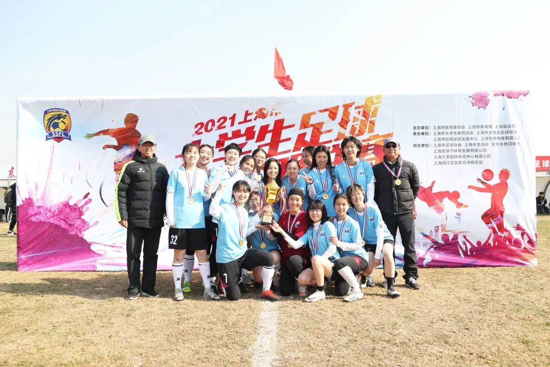 12月30日上午,复旦女足迎来了本项赛事的决赛,对手是卫冕冠军同济大学女足。上半场开场不久,复旦女足便抓住机会,由陈垚宇打入一球取得领先。随后同济女足10号队员打入单刀球扳平比分。比分扳平后,复旦女足队员们没有慌乱,在场面被动的形势下,所有队员每球必争、团结一致,在做好每一次防守的同时积极寻求反击机会。最终常规时间结束,双方1比1战平,比赛进入残酷的点球大战。在点球大战中,复旦女足队员们顶住了压力,四名主罚队员全部打进,同时守门员赖俊衣奋力扑出了同济女足主罚的第三粒点球。最终复旦女足常规时间1比1、点球大战4比2,以5比3的总比分战胜同济女足,捧起了2021年上海市大学生足球联盟联赛女子校园组的冠军奖杯!