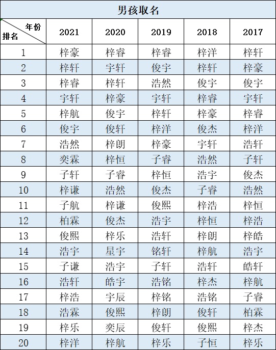 排名第2至10的男孩名字为梓轩、梓睿、宇轩、梓航、俊宇、浩然、奕霖、子轩、梓谦。男孩取名单字的前5名为睿、昊、皓、越、辰。