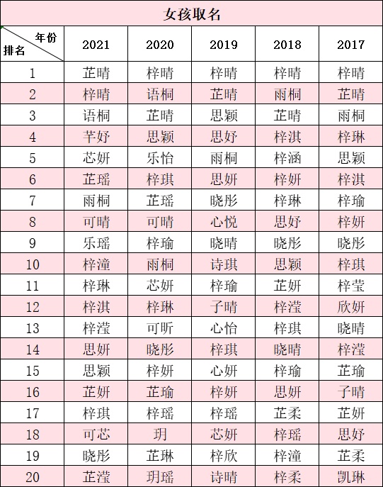 排名第2至10的女孩名字为梓晴、语桐、芊妤、芯妍、芷瑶、雨桐、可晴、乐瑶、梓潼。女孩取名单字的前5名为可、玥、悦、滢、果。