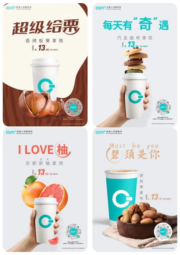 COFE+现磨咖啡的两侧各有一个点单屏幕,点击进入后足足有近50多种口味可供选择。最近,机器人咖啡亭还推出了香烤板栗拿铁、榛果抹茶拿铁、碧根果拿铁、南城野橘摩卡、焦糖海盐摩卡、焦糖海盐巧克力、榛果牛乳等足足15余款冬日新新品,满足不同口味消费者的喜好。
