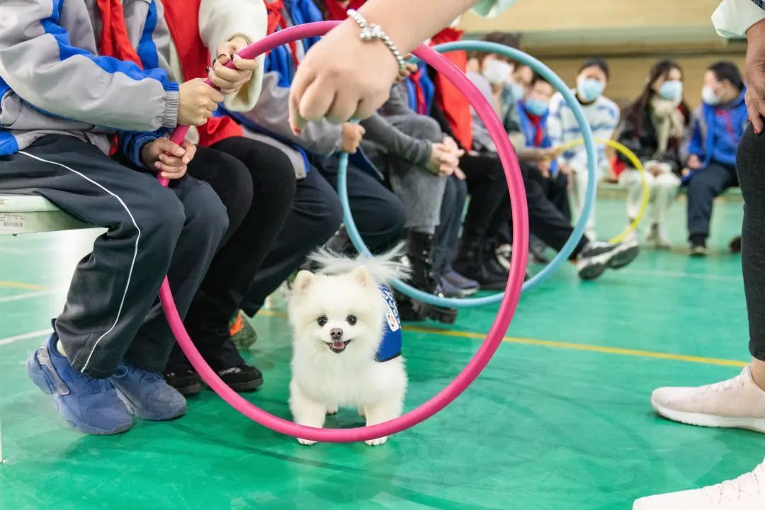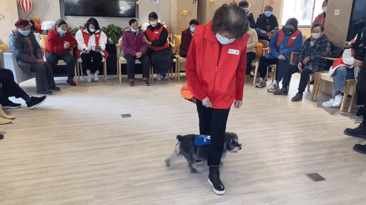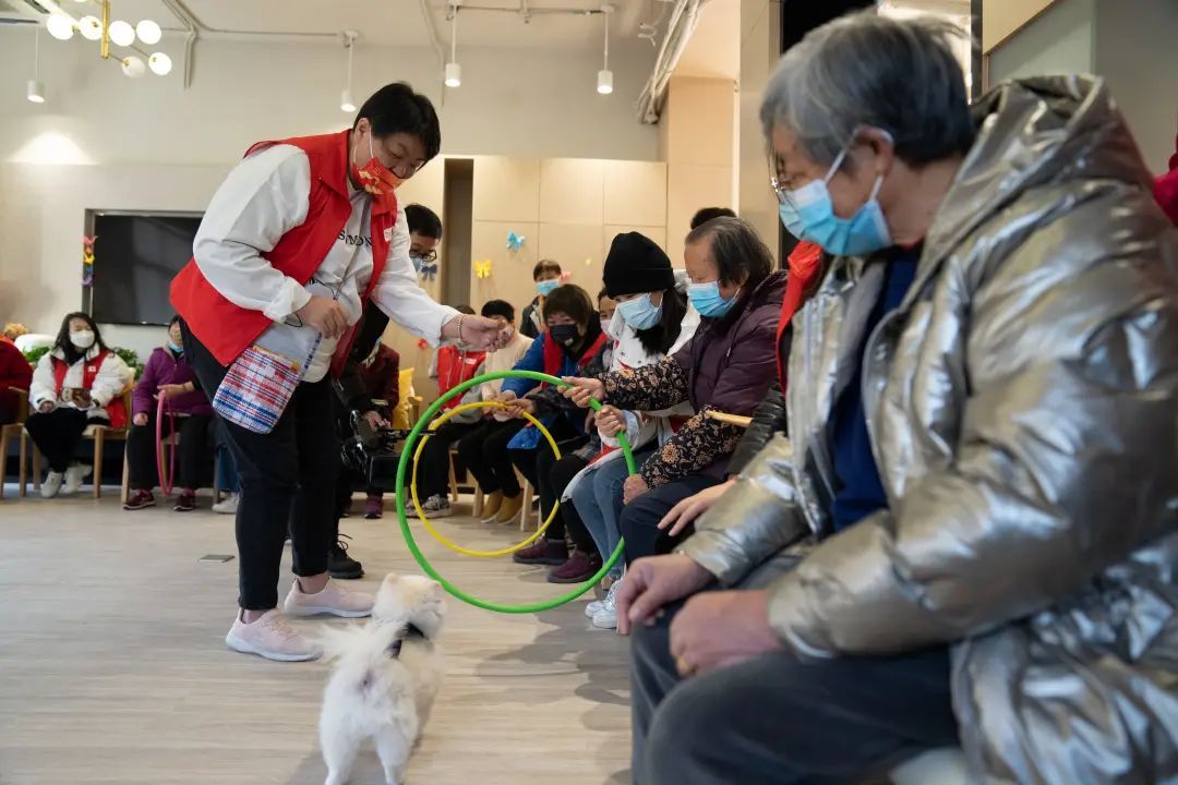 在志愿者的引导下,老人们还与治疗犬进行了一系列互动。志愿者们协助老人手持呼啦圈,让治疗犬从圈中依次跳过。而为了赢得治疗犬的照片,老人们也不再拘束,纷纷举手抢答题目。