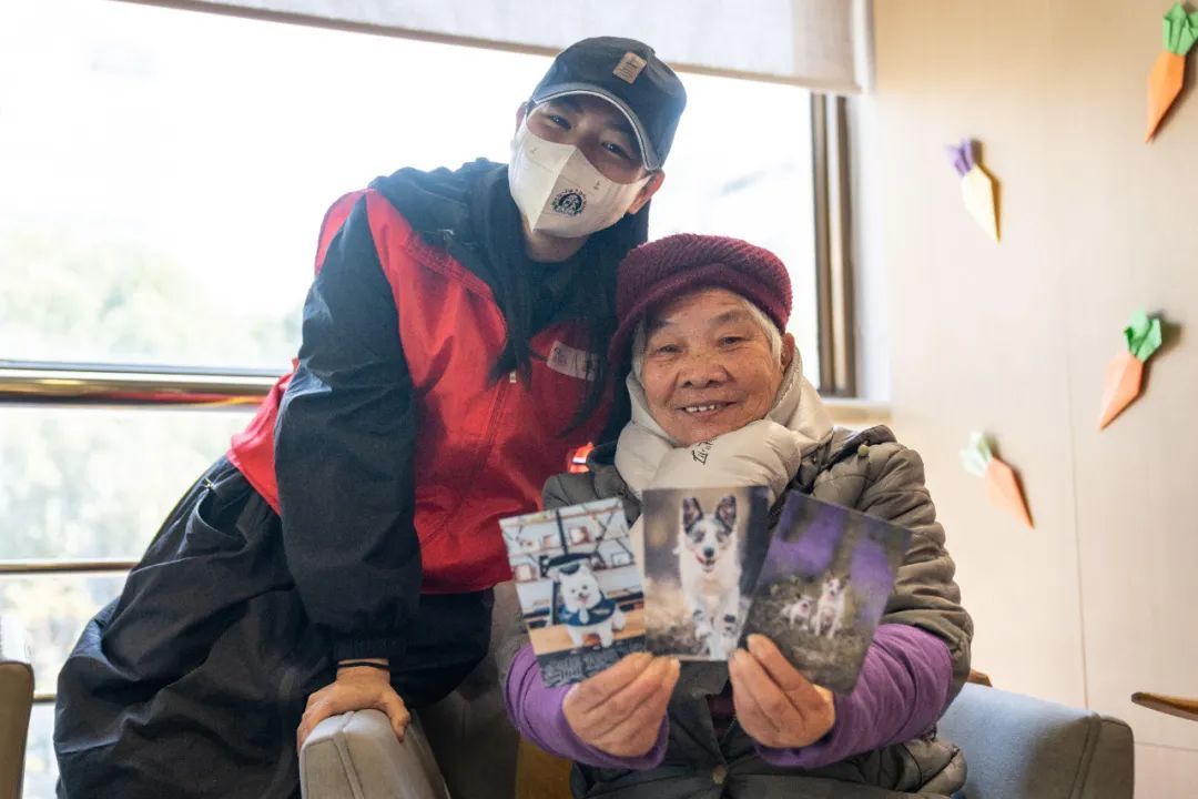 而随着互动的增多,志愿者开始教老人如何与治疗犬互动的口令和手势,并进行分组活动。每位志愿者对应服务一位老人,每只治疗犬对应服务一组老人。在志愿者的配合帮助下,老人可以近距离与治疗犬互动,有的治疗犬侧着脑袋贴贴老人们的手心,有的则乖乖呆在老人怀里让人抚摸。老人们都被乖巧温顺的治疗犬打动,恋恋不舍地抱着它们合影留念。