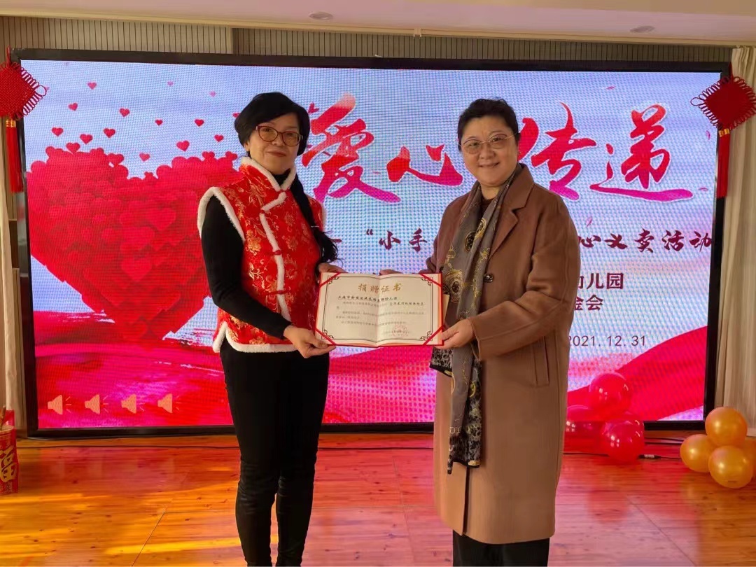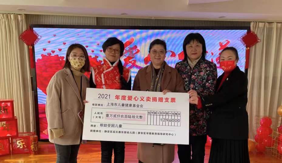 义卖活动结束后,举行了捐赠仪式,园长林丽代表学校,将饱蘸全园孩子真情的本次义卖活动筹集的12960元善款,全部善款捐赠给上海市儿童健康基金会,作为该基金会新一轮儿童健康项目的启动资金。基金会理事长黄敏向延长路东部幼儿园颁发了捐赠证书。