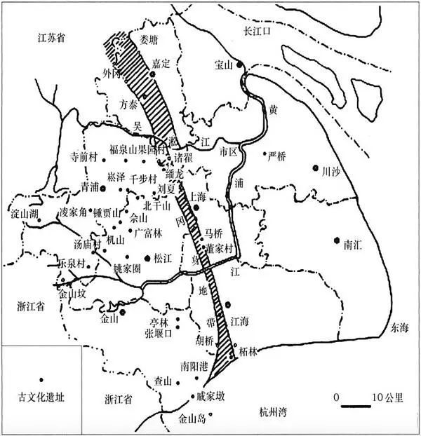 “冈身”,是上海一条古海岸线:沿嘉定外冈、嘉定南翔、闵行马桥、奉贤柘林一直到金山漕泾。作为太湖平原的一部分,“冈身”以西孕育了辉煌的上海古文明。