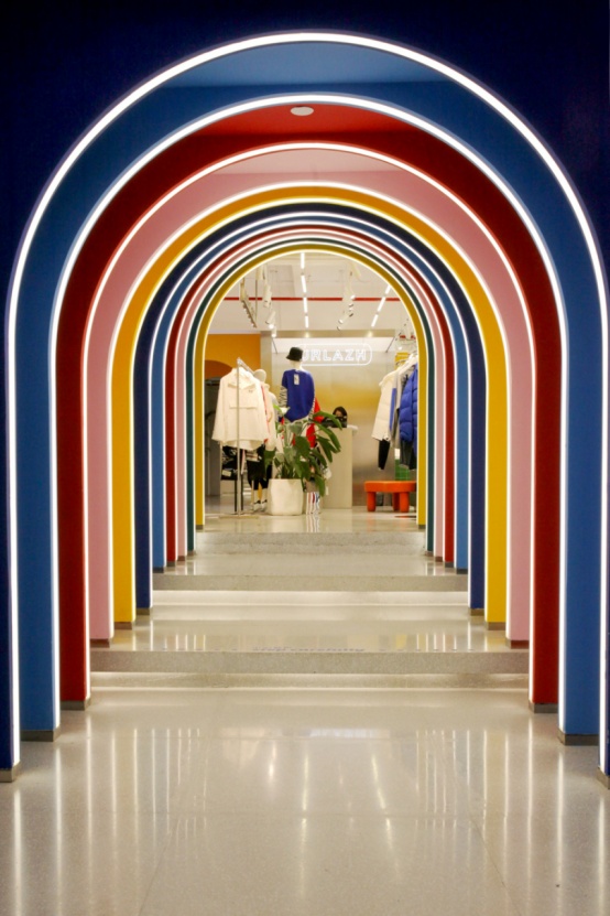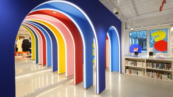这道漂亮的彩虹门是很出片的打卡点位,画面有纵深感。穿过去就是“幸福集荟”书店在魔都的第四家店,有关于设计、文学、生活美学的书籍以及各大博物馆、文创IP衍生品在此展示和售卖。彩虹门里还藏着一场色彩mini展,追溯人类寻找色彩的历史。