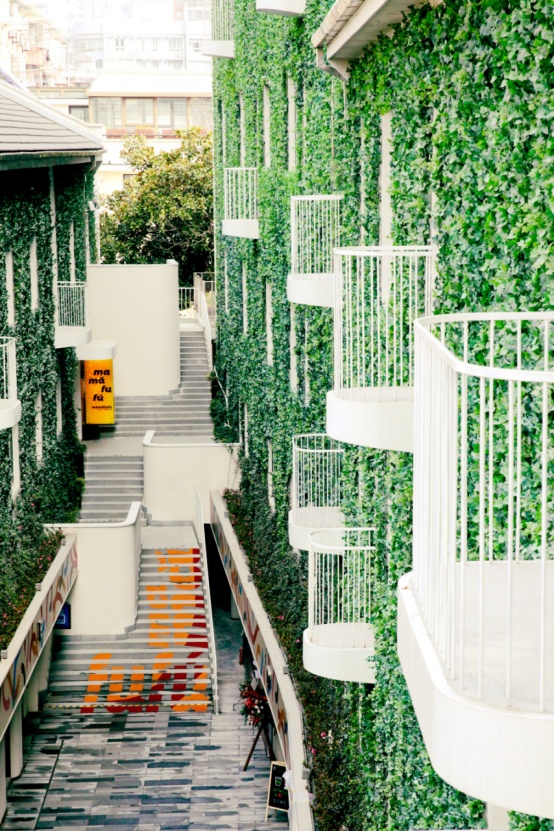 M+马利是一个面向街道敞开的园区,整个绿植墙生意盎然,许多个白色小阳台非常吸睛。在这条并不宽敞的内廊中,楼上书香缭绕,楼下美食飘香。有人站在阳台上欣赏绿植,阳台又成为楼下食客的风景。