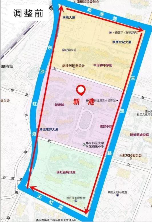 调整后的新港居委会管辖范围:东至天宝路,南至天镇路,西至东沙虹港路,北临新港路。居委会管辖范围包含中信和平家园和四联小区。
