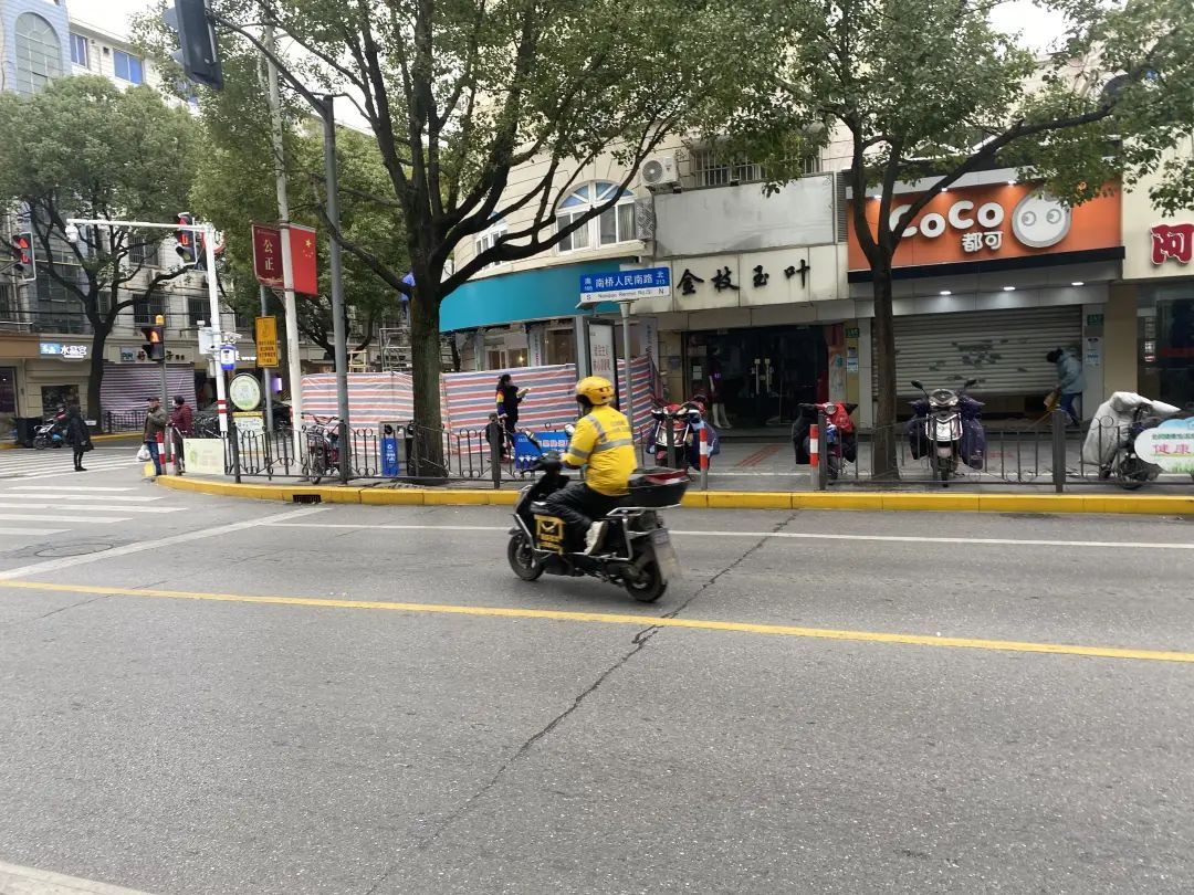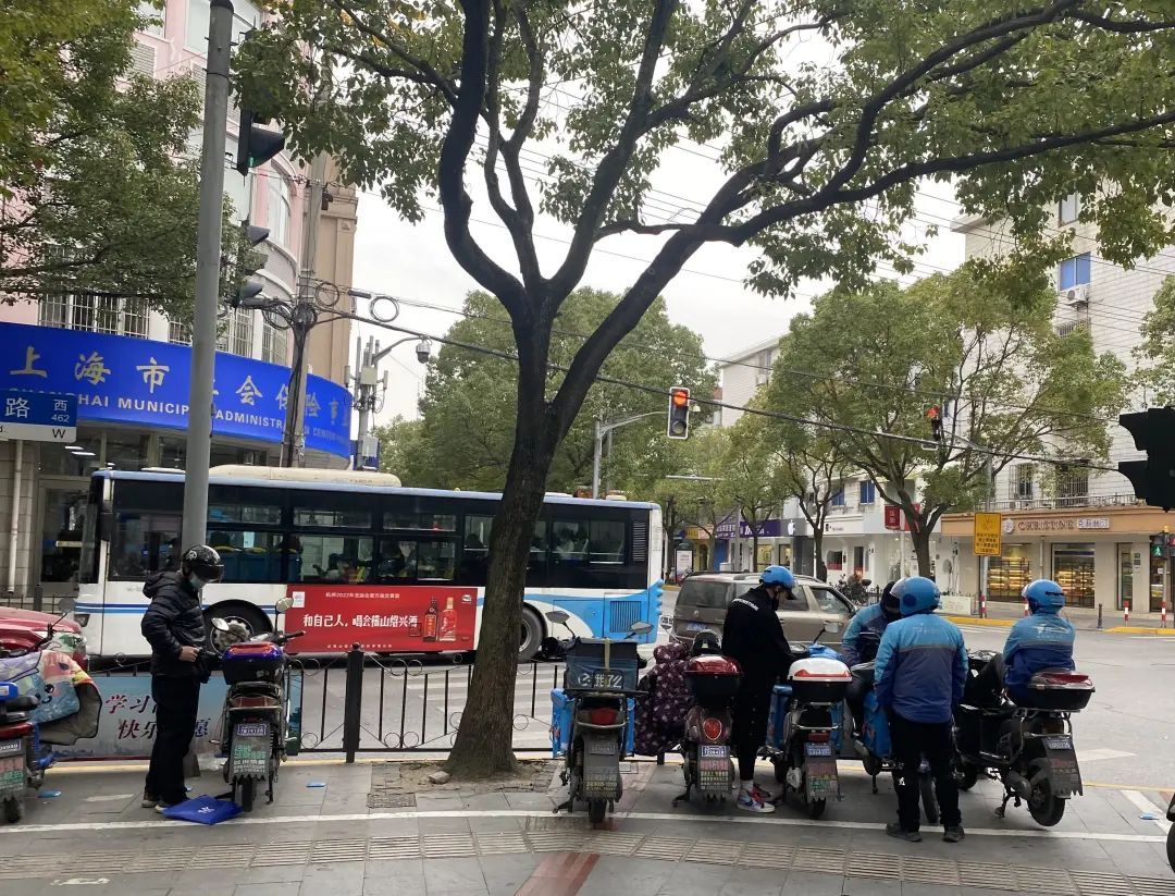 1月5日,在奉贤区南桥镇人民路上,美团、饿了么外卖员都在餐饮较为集中的路段等待接单。记者随机采访了几位外卖员,他们表示已经接到了公司通知,但还没有时间去更换专用电子号牌。