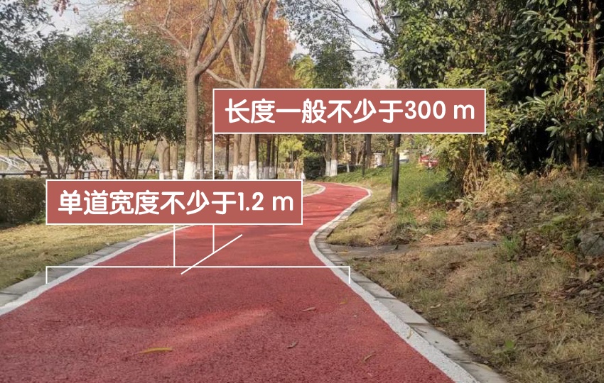 根据相关验收标准,社区健身步道长度一般不少于300 m,单道宽度不少于1.2 m,双道宽度不少于2 m,鼓励建成环状步道。步道建设应做好排水、防污、防滑等措施,并配备全天候使用的地灯或照明灯,设计使用年限不少于5年。