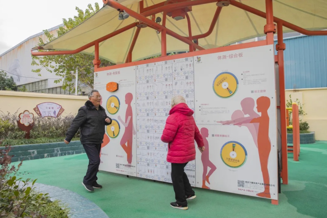 在原有健身器材的基础上,增加多个以力量训练器材为主的器械,辅以少数有氧训练器材以及增加综合性力量训练器械;增加户外身体素质测试器,帮助老年人测试体脂率等指标,让他们可以了解身体素质是否达到标准。
