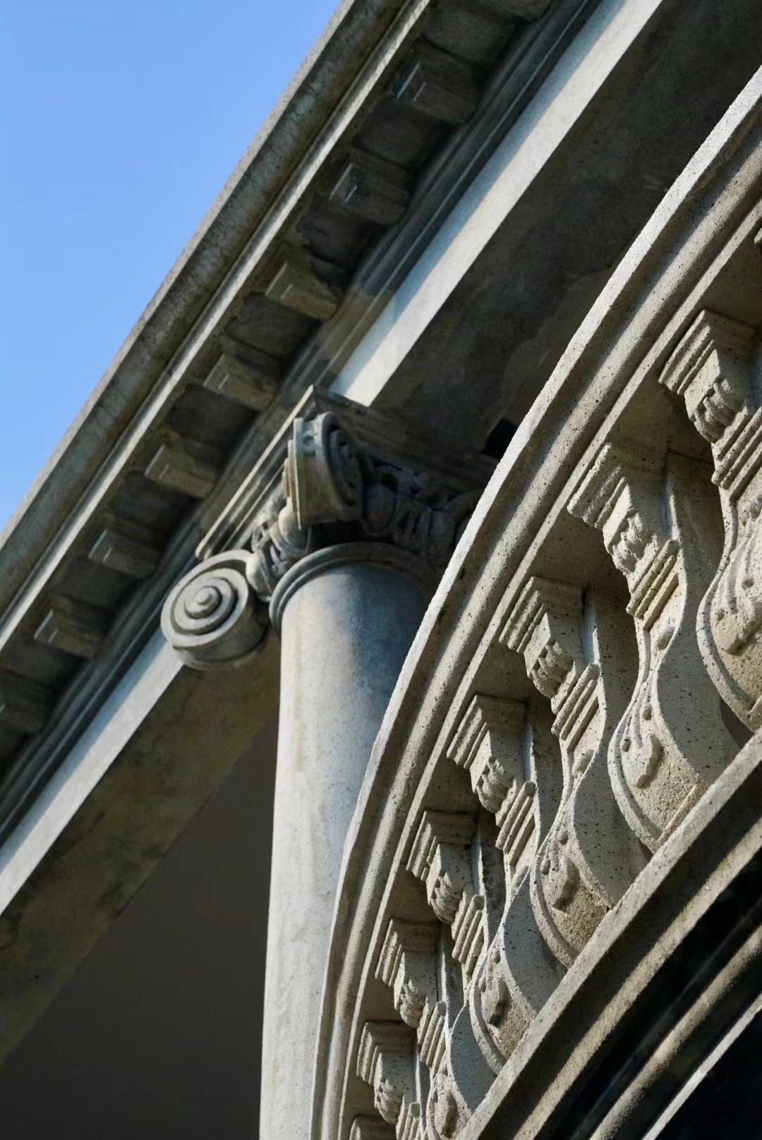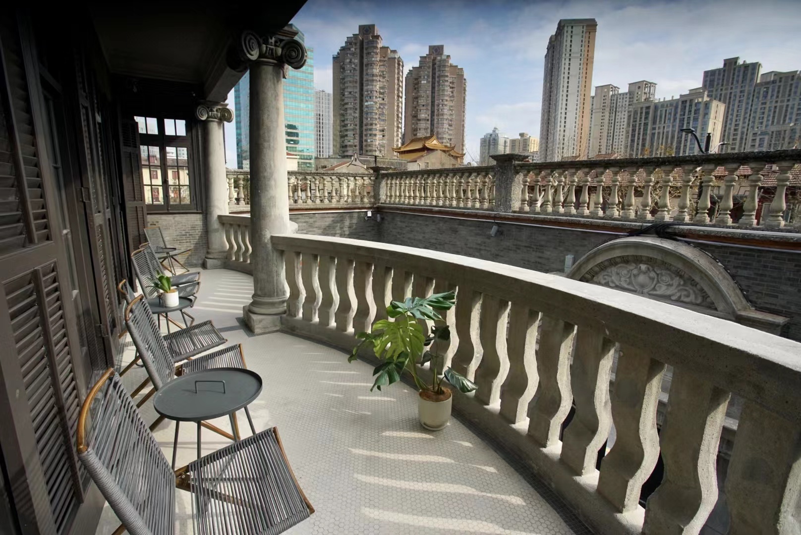 一楼与二楼由8根西式罗马型羊角柱贯穿,二楼宽大的弧形的闲廊与宝瓶柱围栏,包括屋内壁龛、壁炉都很有上海中西交融的建筑特色。