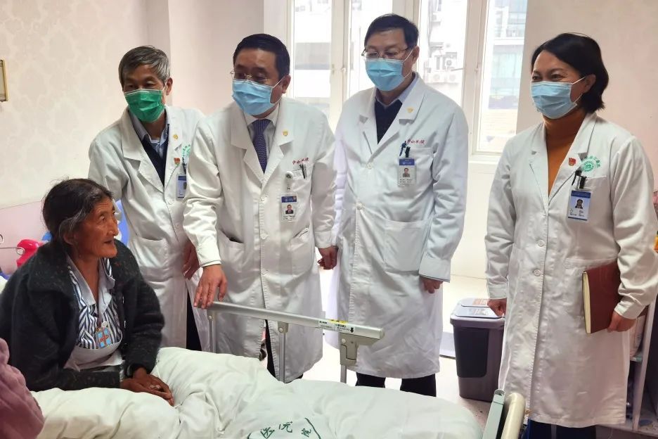 1月7日,复旦大学附属中山医院普外科副主任、中山医院医联体徐汇区中心医院执行院长刘厚宝教授,徐汇区中心医院党委书记张雪梅带着医护团队来到病房为努增阿妈送行。复旦大学附属中山医院副院长、徐汇区中心医院院长周俭教授也特地跟阿妈进行了视频连线,“阿妈有什么不舒服就联系我们的援藏医生,我们一定想办法帮你解决!”阿妈激动地握住医护人员的手,用藏语和藏族的礼仪方式表达了感谢,并献上了准备已久的哈达。