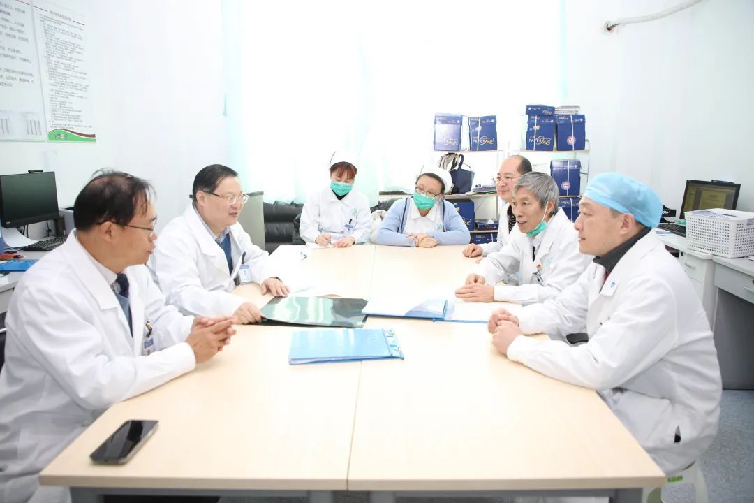 12月20日,在徐汇区中心医院刘厚宝执行院长、外科马世红副主任、陆怡护士长陪同下,患者赴中山医院由介入科主任颜志平主任医师、钱晟副主任医师进行了背部肿块滋养血管栓塞术,术中发现瘤体血供来源于左侧胸骨下动脉甲状颈干分支和右侧锁骨下动脉的肋颈干分支。为了减少术中出血风险,决定术前先行背部肿块血管栓塞术。麻醉科缪长虹主任建议术前要做好心肺评估和备血。亓发芝主任对术中患者的体位摆放、手术方式、皮瓣缝合方式做了系统的规划。为保证手术的顺利进行,徐汇区中心医院组织了心内科、呼吸科、介入科、放射科、ICU、麻醉科、营养科及护理部等进行了全院大会诊,全面讨论评估了患者对手术的耐受能力以及术后恢复的注意事项。
