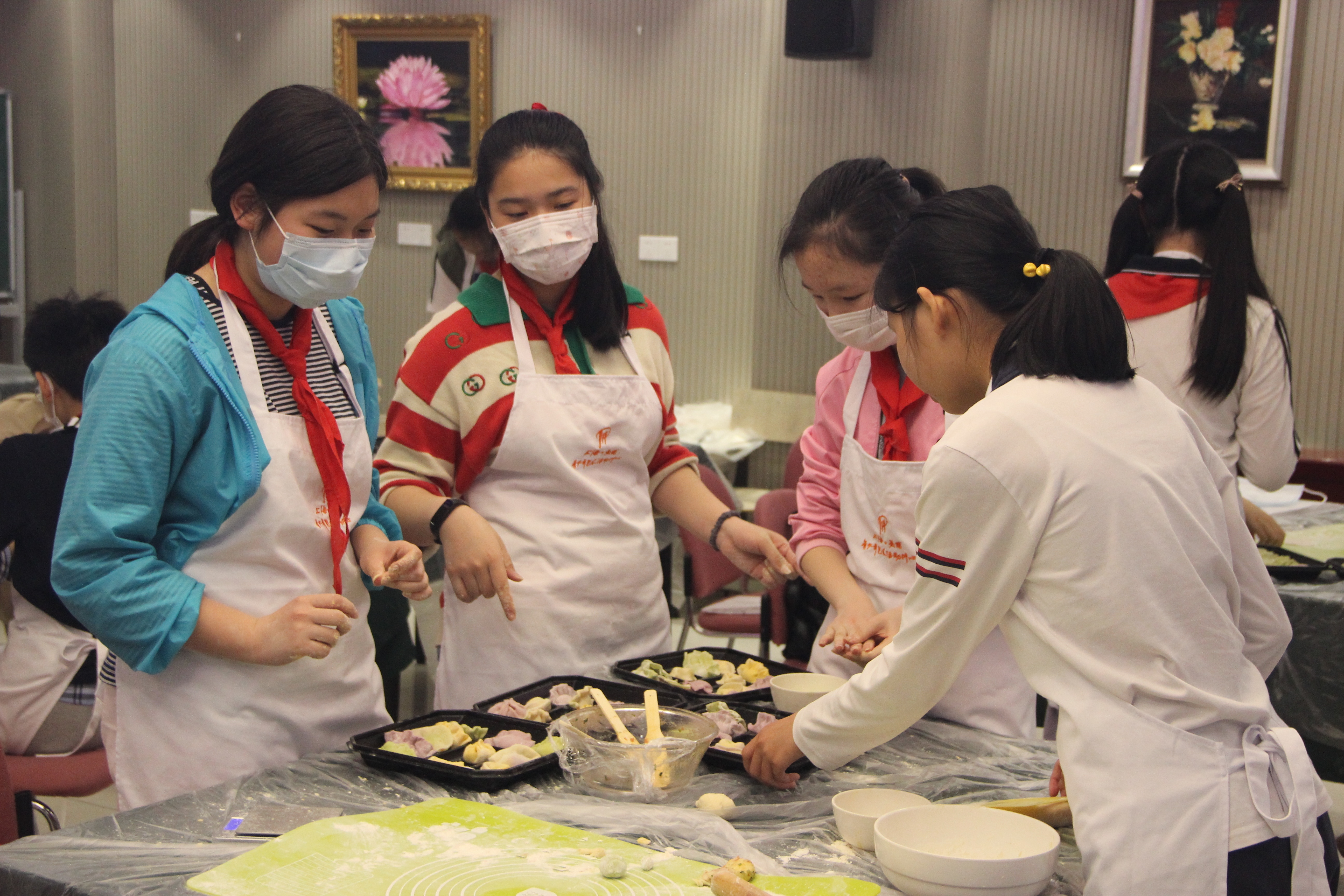结合本市开展的首届“学生劳动教育宣传周”活动,2021年5月4日,中心举行了“劳动的成果最甜美——学生创意烹饪”劳动教育主题活动。在“品品我家私房菜”环节,师生一起寻找熟悉的家中本味,探寻其来源与意义。“创意饺子我来包”环节则通过实际行动传承中华传统美食的魅力,同学们分工合作,洗菜、切菜、揉面,并给饺子皮加入南瓜汁、火龙果汁、菠菜汁等天然色彩,增添美食的创意和趣味。