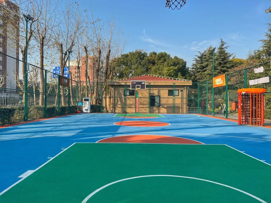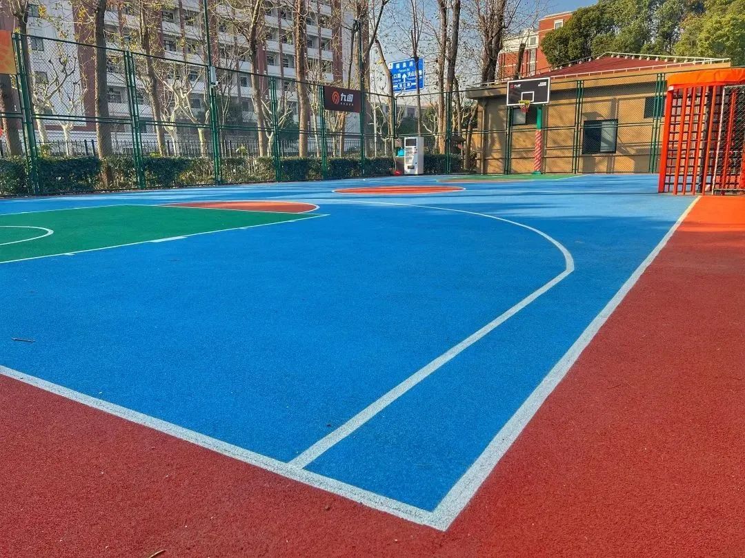 崭新的篮球场以靓丽的蓝色和红色分区,在蓝天白云的映衬下显得格外酷炫。据了解,这块篮球场所用的新材料是预制型塑胶,具有安全、无污、色彩鲜艳、舒适等特点。