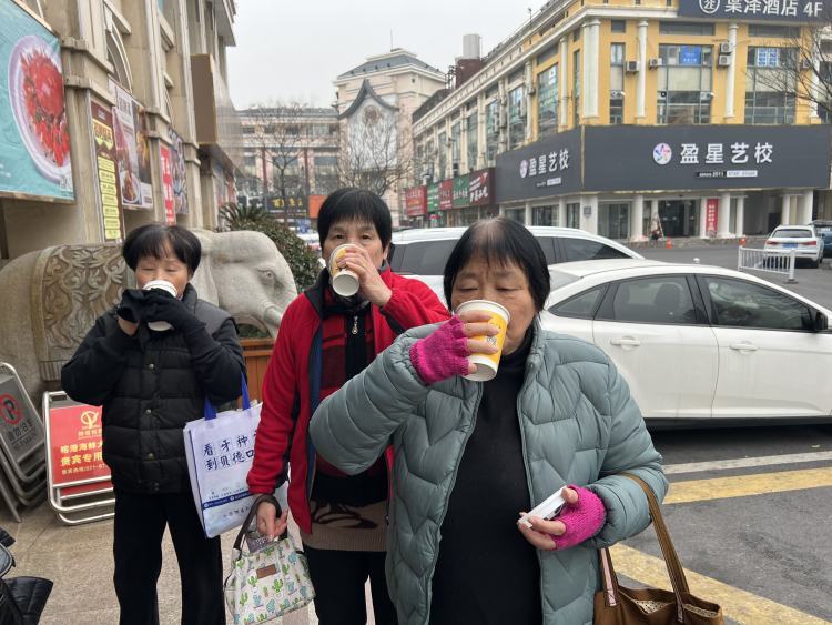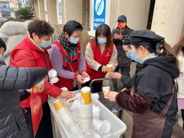 今天清晨,方松街道祥和商圈广场上十分热闹,居民、环卫工人、保安排着队正在这里领取附近商户准备的一杯杯热气腾腾的腊八粥。