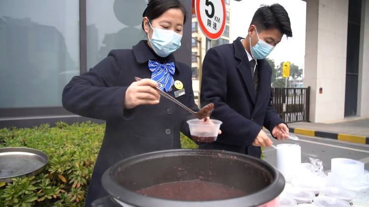 今天一早,小昆山镇山水华庭居民区特意制作了腊八粥,送给早起赶路的上班族、应防疫要求正在居家观察的居民,以及社区高龄、独居老人等。