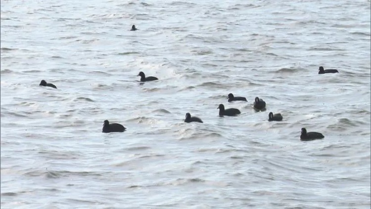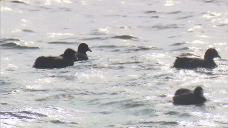 除了鸭子,还有数量庞大的白骨顶聚集在滴水湖。白骨顶是秧鸡的一种,全身黑色,头上额甲部位是白色的,喜欢集群在岸边水域活动。每年冬天,都有数百只白骨顶在这里越冬。在这个季节,在滴水湖一号码头和北岛附近水域湖面,无论白天还是傍晚,都能看到三三两两结伴的白骨顶鸡结伴“游湖”的身影。