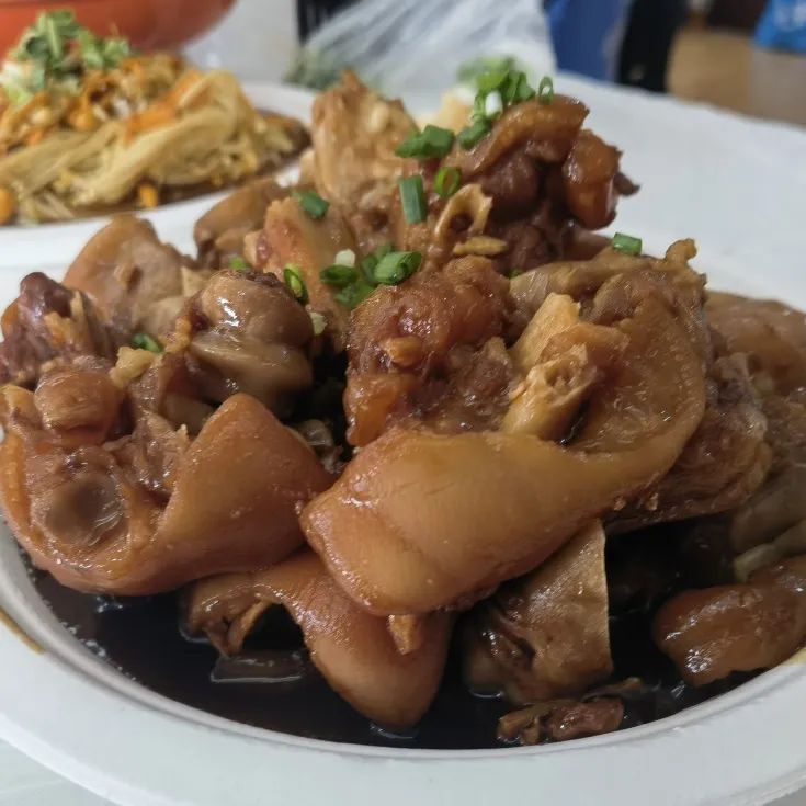早上9点不到,居民们就带着热乎的菜品来摆盘装饰。除了腊八粥、红枣莲心糖藕等腊八美食外,还有红烧肉、素什锦、红烧猪蹄、油爆虾、烤麸、回锅肉等家常美味。