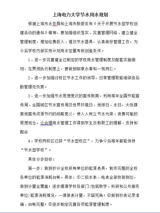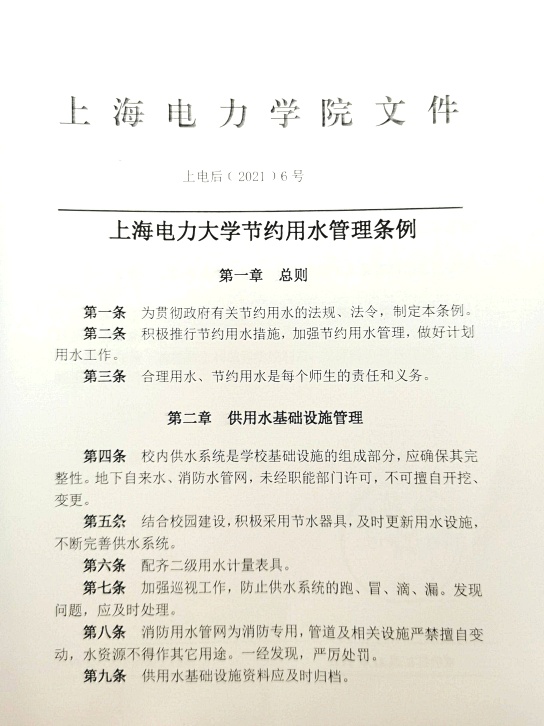 制定《上海电力大学节约用水管理条例》、《上海电力大学节水用水规划》等多个制度,保障节水工作的顺利开展;定期组织技术人员对用水设备、管网系统等进行巡视检查,发现跑冒滴漏现象及时安排维修堵漏工作,并做好巡检维修记录;建立用水档案,将搜集的有关资料、原始记录和实测数据,进行处理、分析和计算,形成一套完整详实的包括图、表、文字材料在内的用水档案。