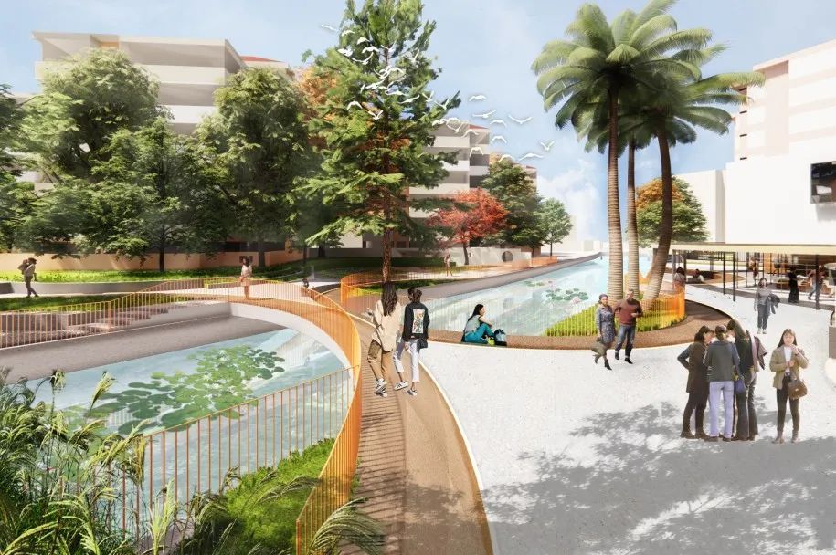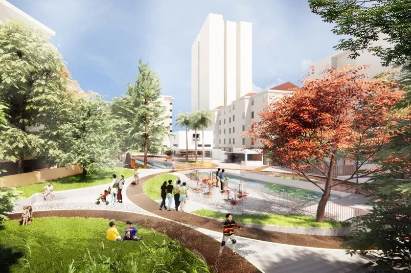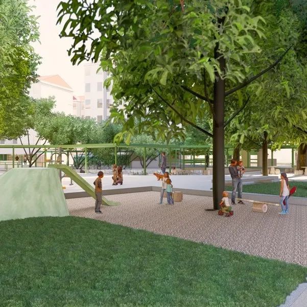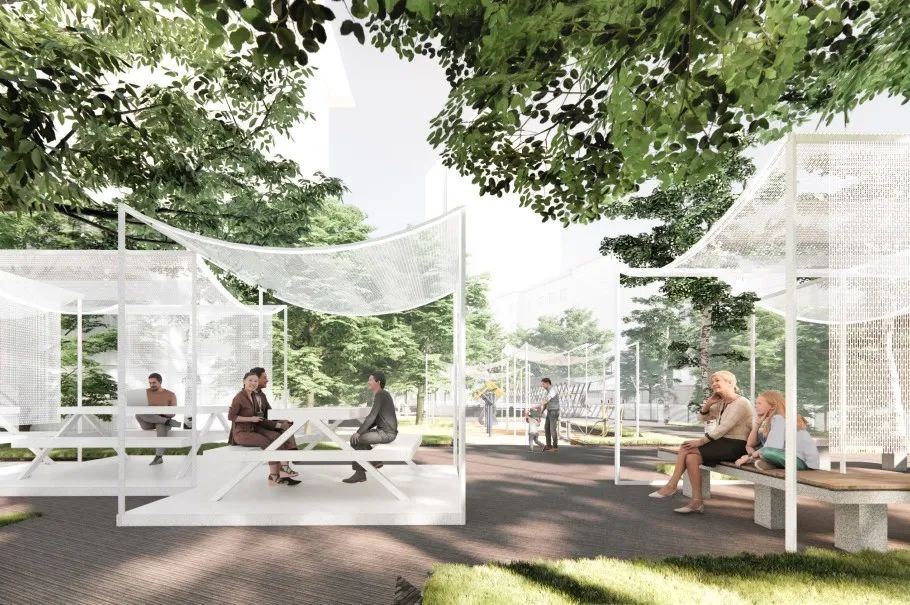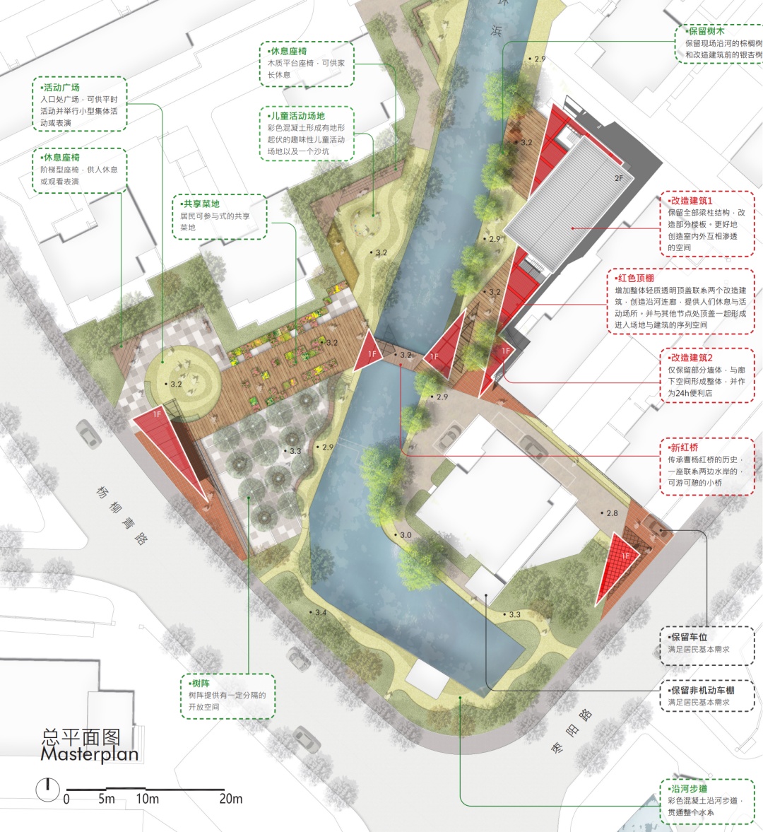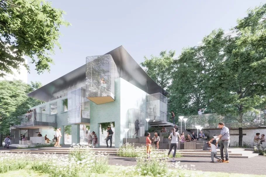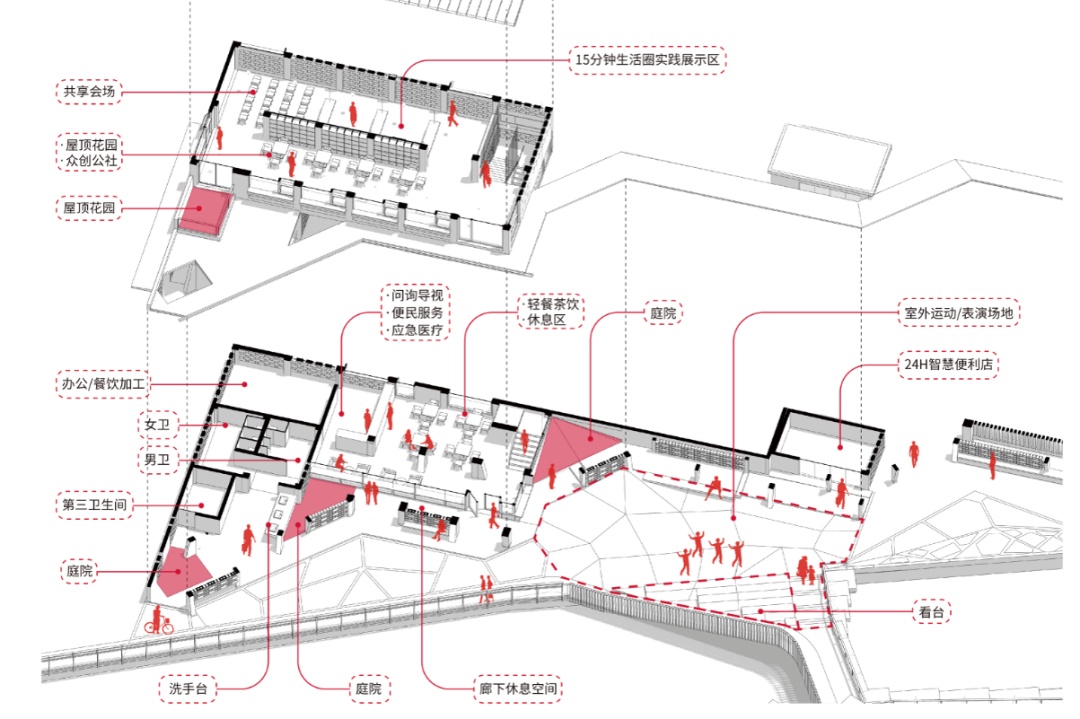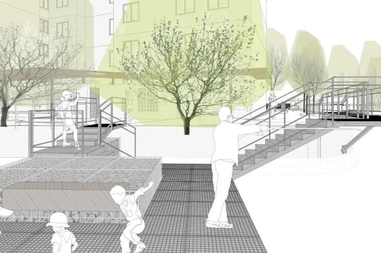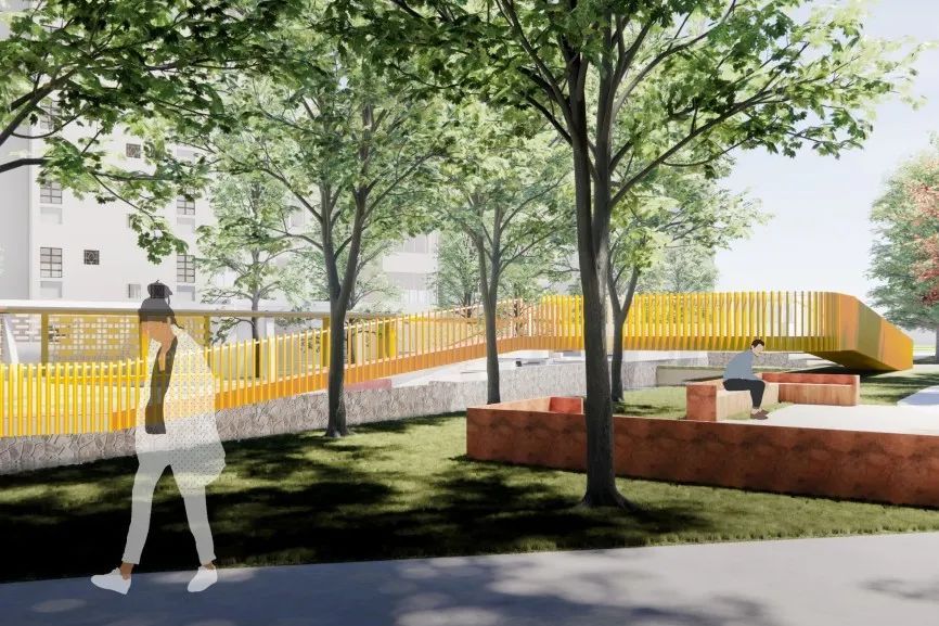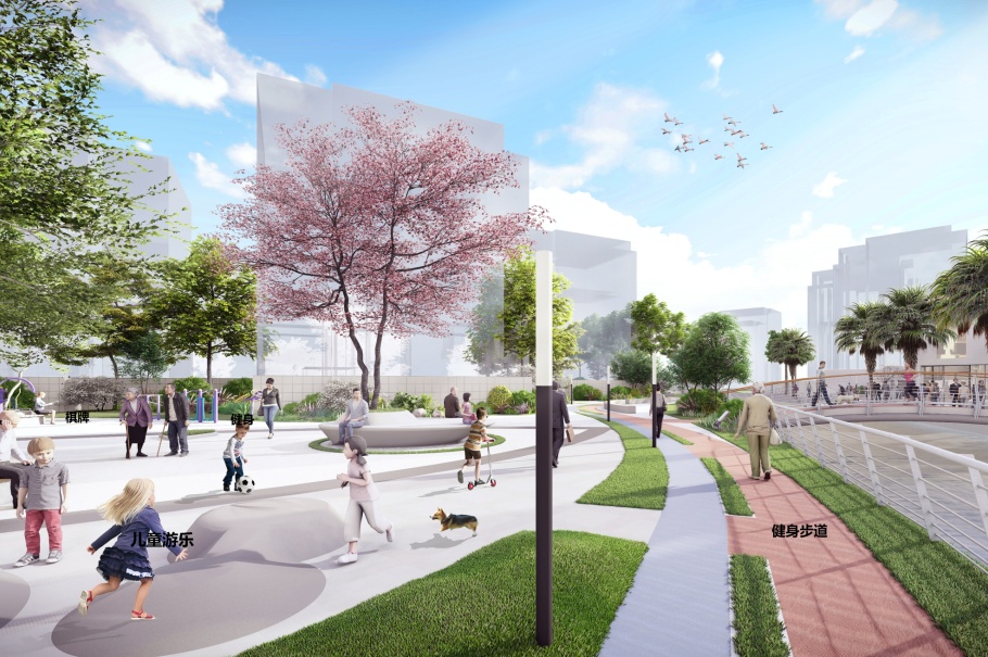 以灵动的滨水步道串联不同的多功能空间用于开展各种社区活动:浅丘起伏的空间体验为儿童游乐带来空间的乐趣;开敞的广场、幽静的草地为居民提供充满特色的休闲场所。增加了社区与驿站的联系,创造活力灰空间。