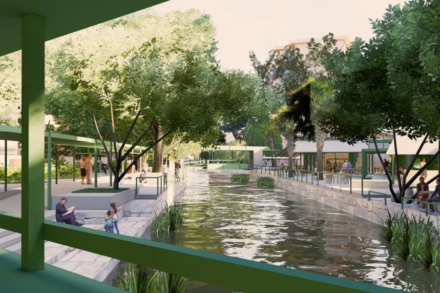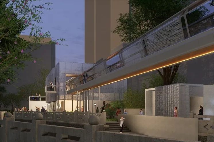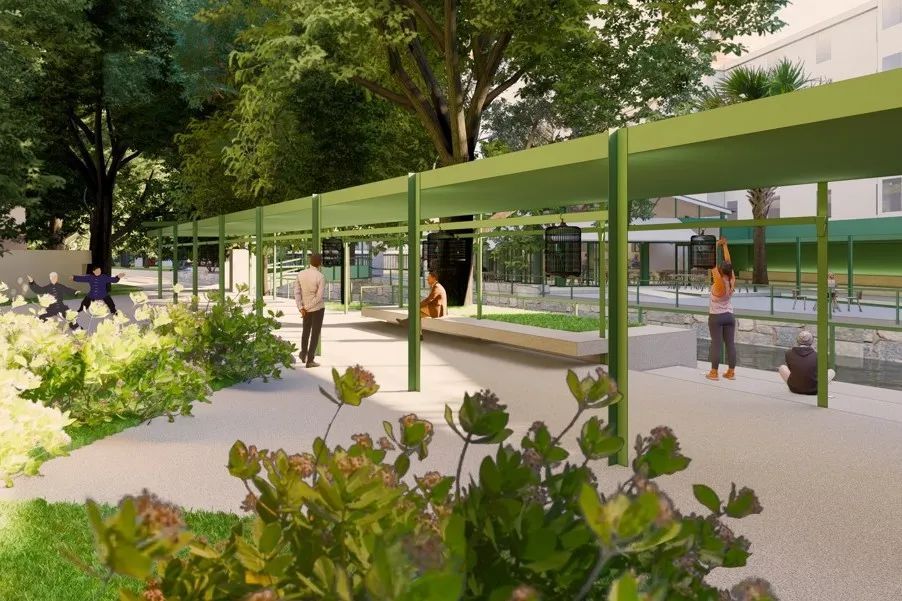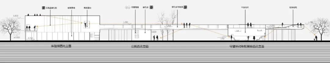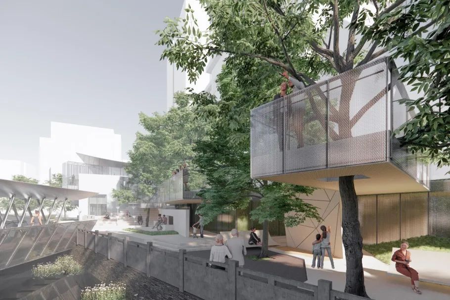 ▲由驿站延申的树廊将场所树木保留,形成了檐下全天候微庭院、绿植包裹的公厕走廊同时,创造了高线观河走廊,亲子攀岩、观鸟平台等趣味空间。