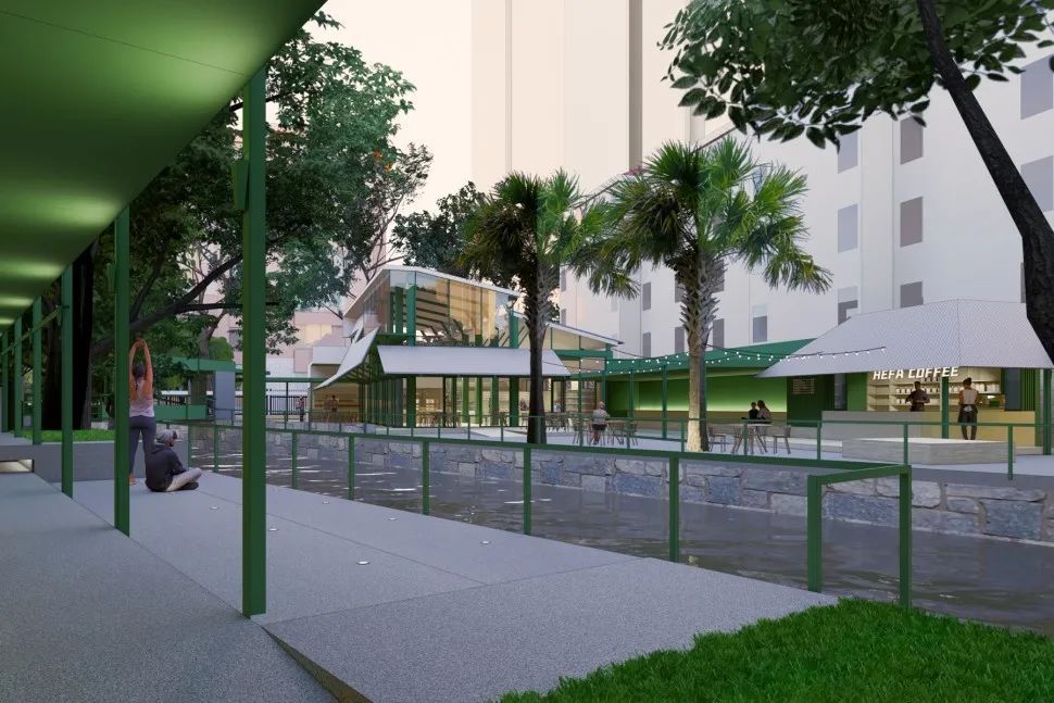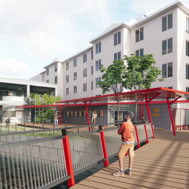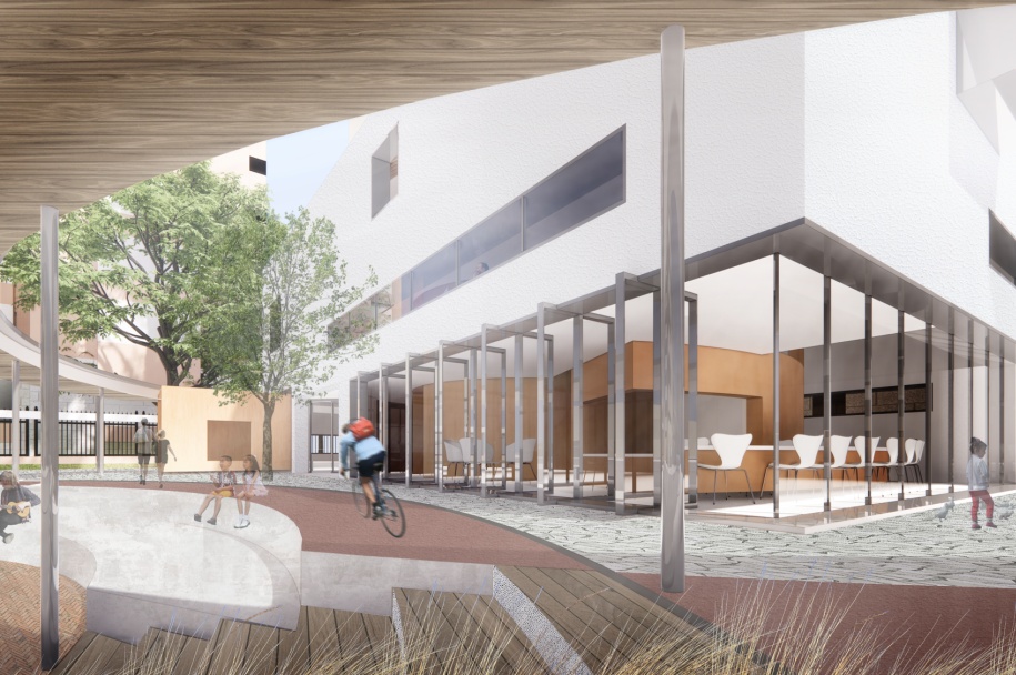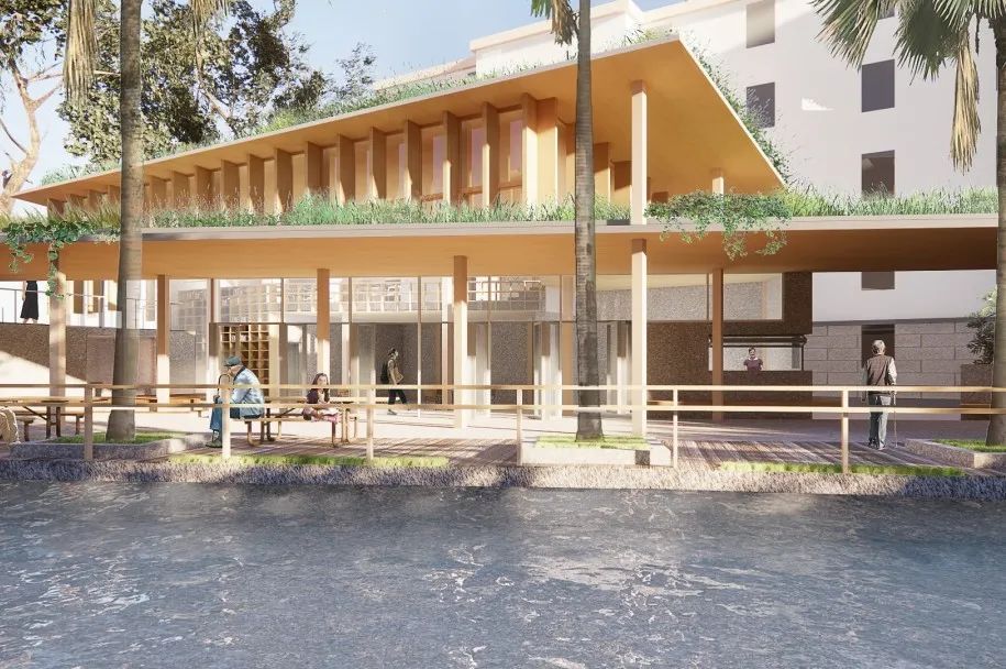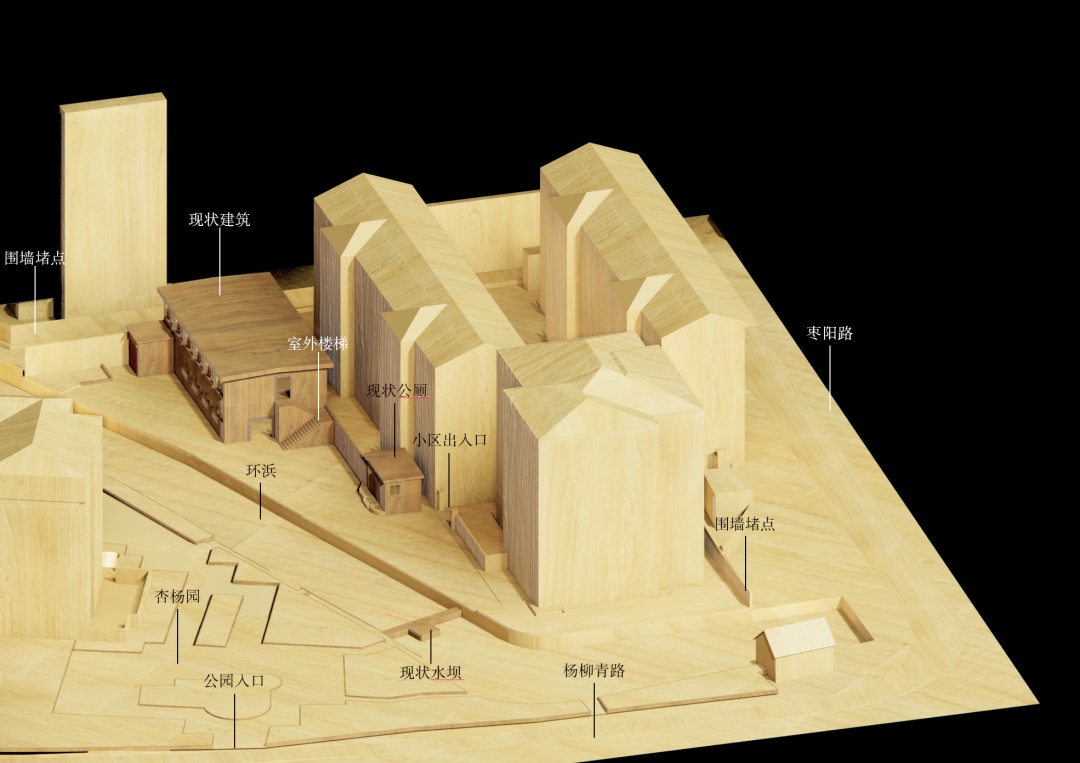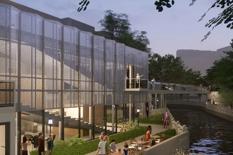 专家点评:此方案基于环浜景观贯通的整体规划,将杏杨园与对岸的连桥来重新缝合城市中的碎片化景观。设计将建筑的底层打开,结合与桥连接的雨棚和檐廊,形成开放共享、容纳多样的公共服务空间。