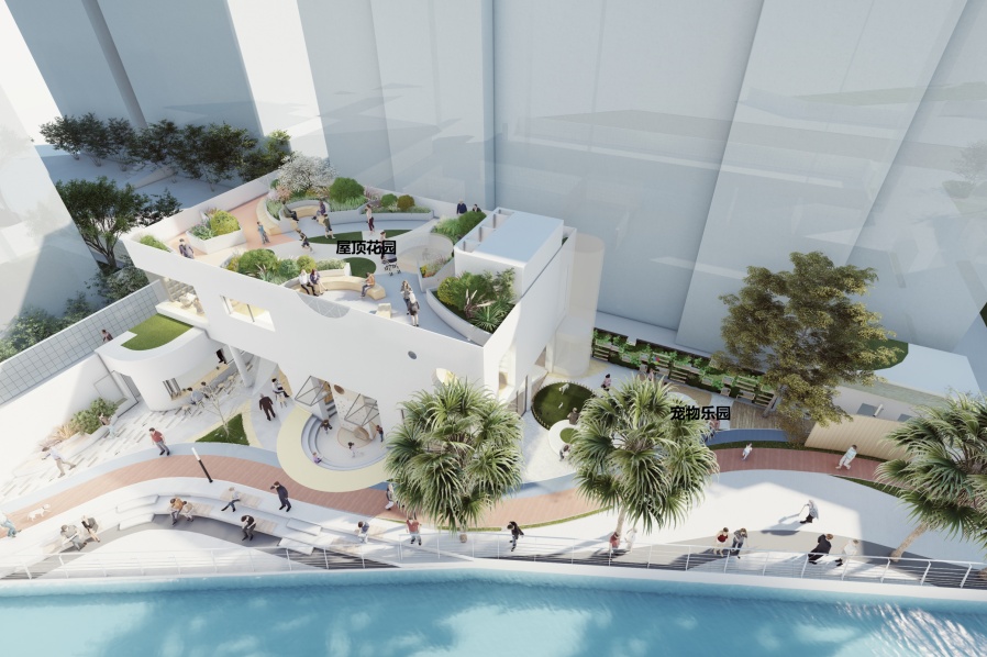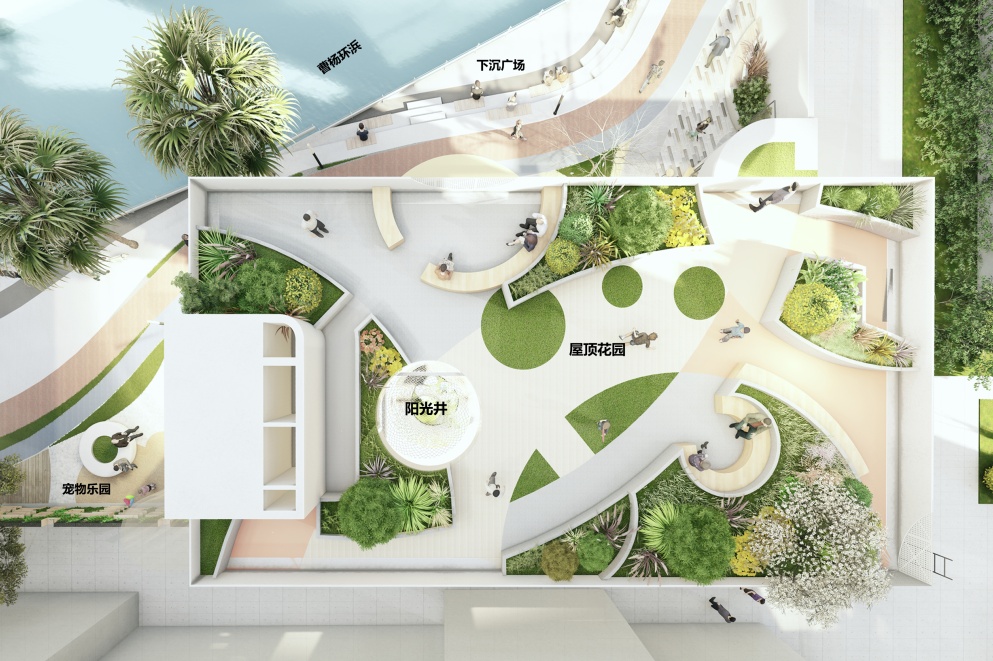 专家点评:方案通过建筑外立面与屋顶花园来增强建筑与周围环境整体协调性,并结合利用屋顶花园采光井,增加室内采光,使建筑更为通透。