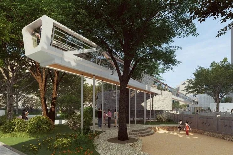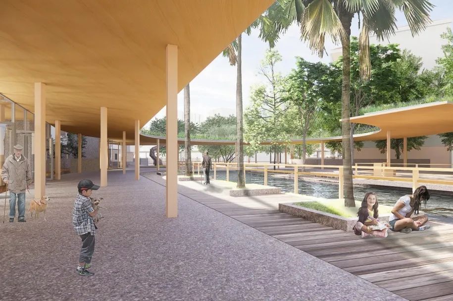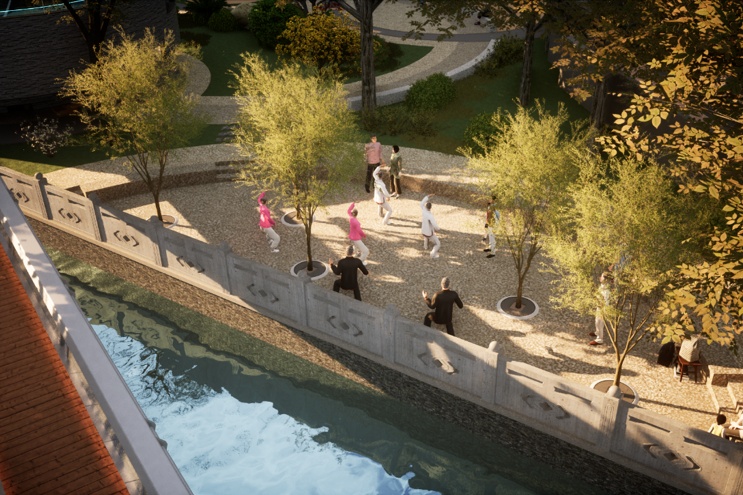 方案采用江南水乡中随处可见的风雨长廊将每个部分联系起来,风雨长廊可为沿线的活动场地提供遮风避雨的支持,老人们下棋打牌、遛鸟唱歌等活动都将不受天气阴晴的限制。这样一个开放的园林,既是生活馆、步行桥和花园的载体,也成为了来自城市四面八方人流的接入口。提升可达性的同时,人们只要进入长廊营造的园林系统,则生活馆的公共性就有了基本的保障。