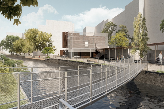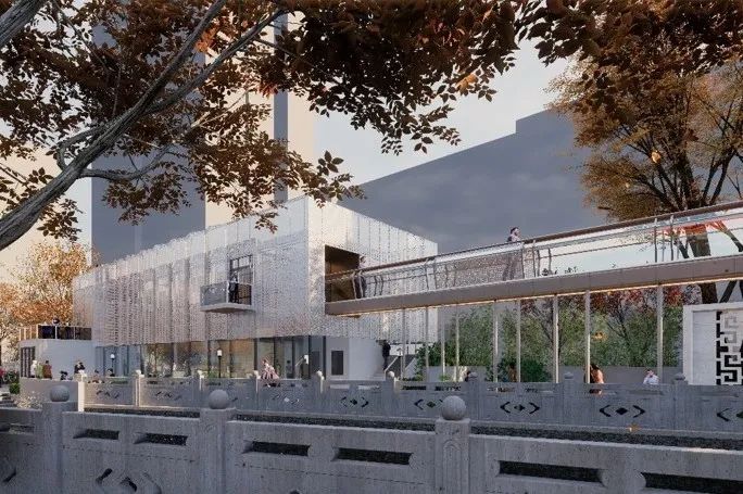 方案设计亮点是利用桥的设计将西侧住宅的轴线关系引向东侧地块,并延伸成为建筑的雨棚与檐廊,让两岸的景观与建筑在几何关系上建立联系。