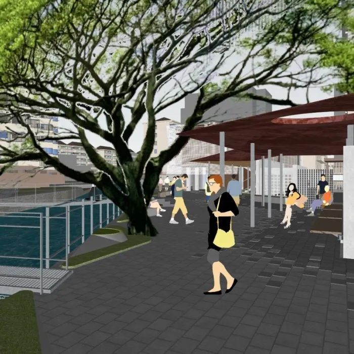 专家点评:该方案与周围环境相结合,采用渗透、融合的设计思路,重新梳理岸线绿化,场地铺装,以及座椅、栏杆等部品,方案统一而充满变化、整体而不失局部细节。