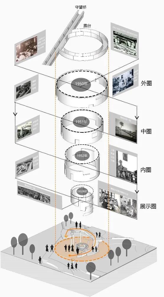 年轮展廊设计馆外面三圈展墙分别代表着1950、1951、1952年曹阳村的历史故事,内部则是1952年后新生的曹杨村。同时以年轮展墙为中心进一步向场地四周辐射形成公共活动的广场等空间。