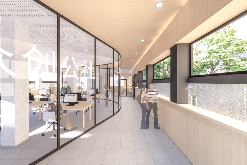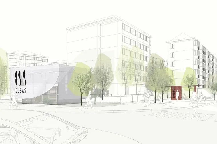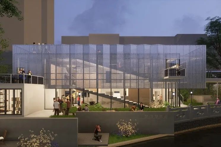 将原有老厂房改造为具有丰富体验空间的驿站来容纳周边的居民公共活动。两个主立面设计为通透的玻璃幕墙加穿孔板的形式,行人由外部可窥见内部空间活动。
