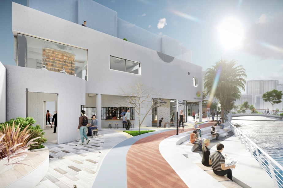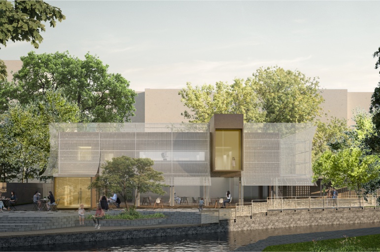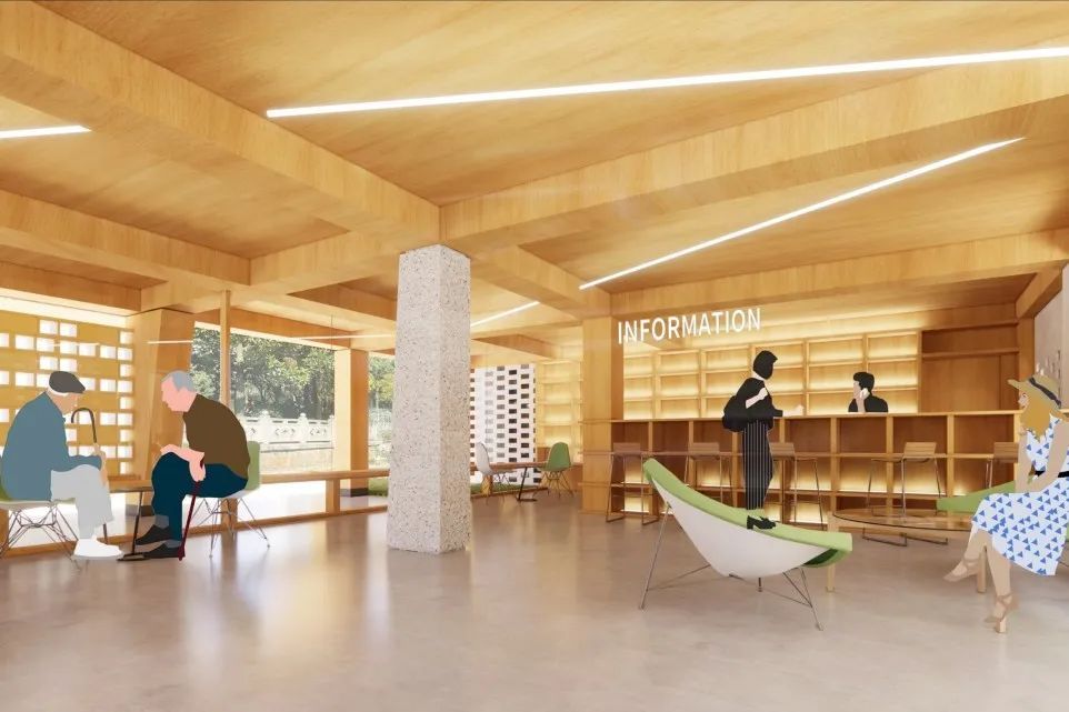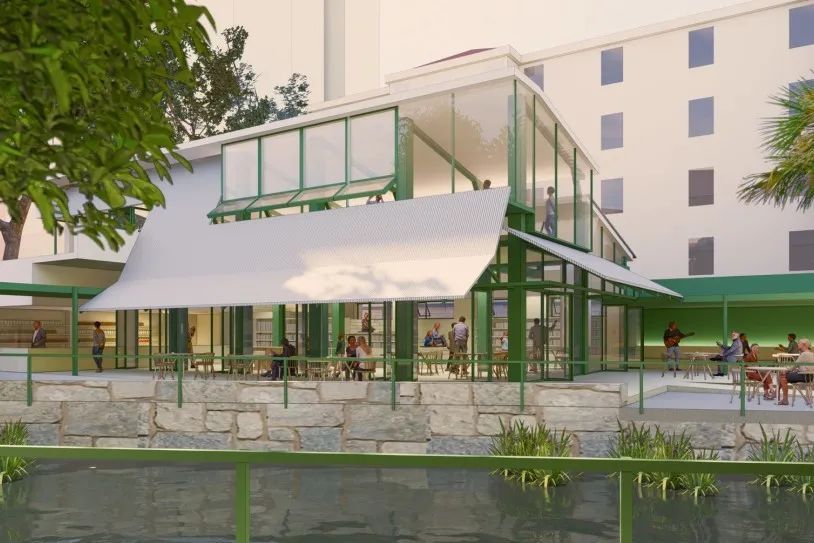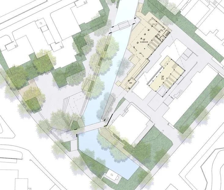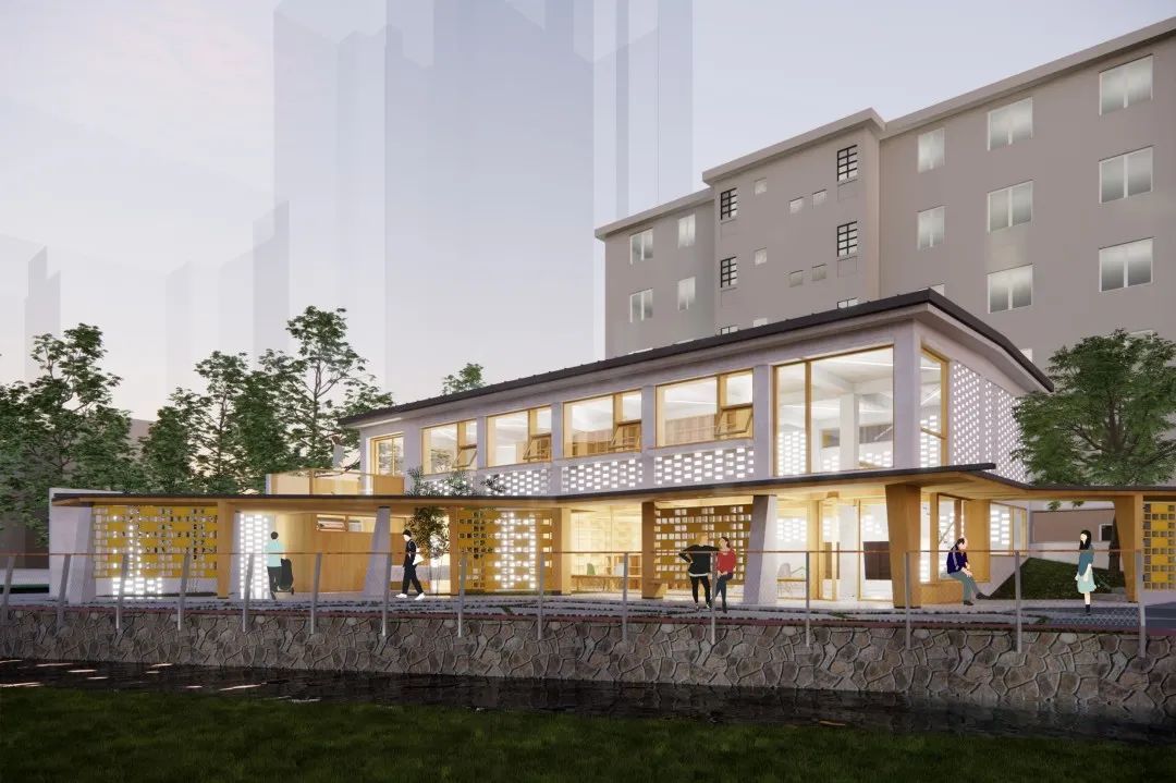 生活馆的现状由一个框架结构的二层建筑及其附属构筑物组成,通过降低南侧建筑结构,为紧邻的建筑争取更多的日照与视线通廊,同时通过一层贯通的折叠门扇与二层的落地窗,打通建筑内部与水岸的界限,水岸的公共活动与周围的景色可以更广泛地进入建筑内部,为一层的阅读与茶歇提供绝佳的室内品质。