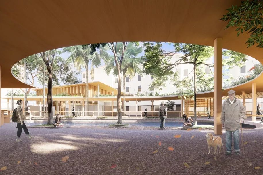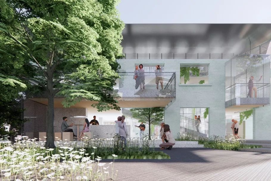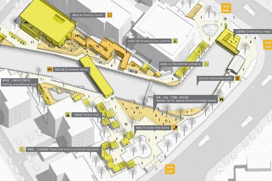 专家点评:方案通过空间的介入,从多个层面分级共享、模糊、打破边界,从而达到边界内外的平衡共生。通过建立全新的柔性边界——飘浮的屋顶,用多重灰空间与轻质网状维护墙体打开原本封闭的边界。