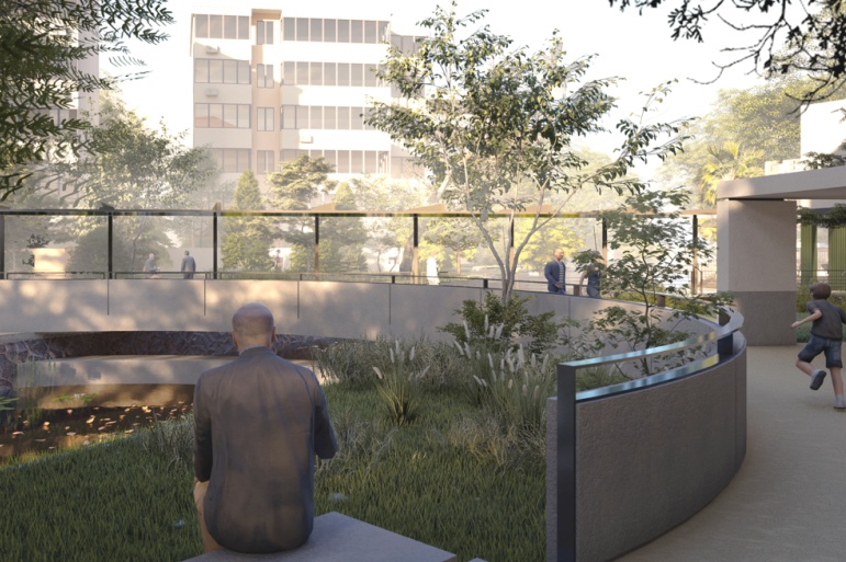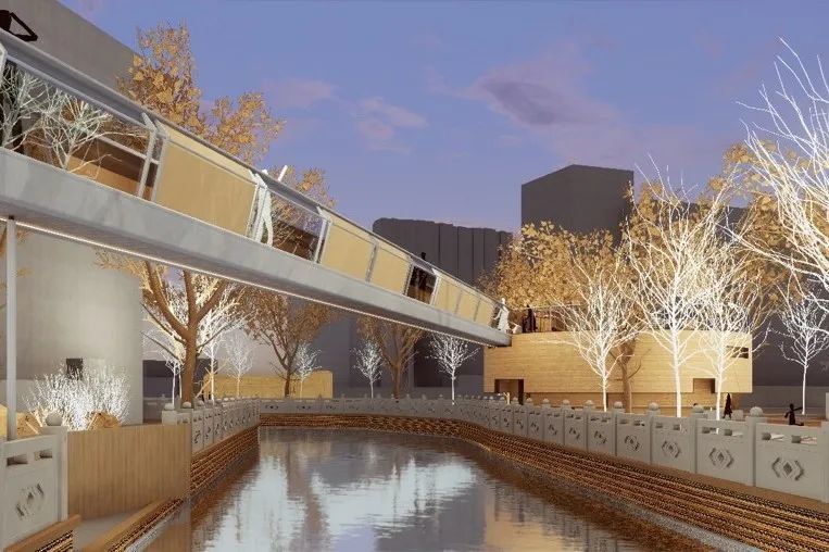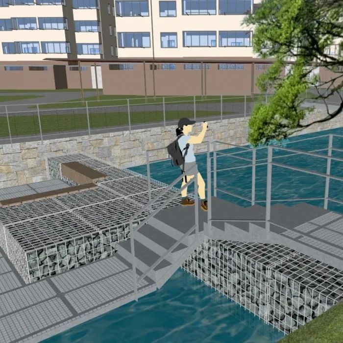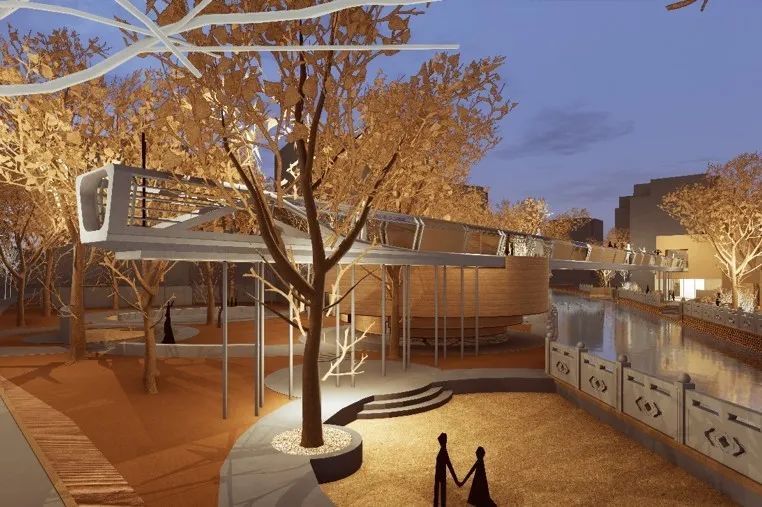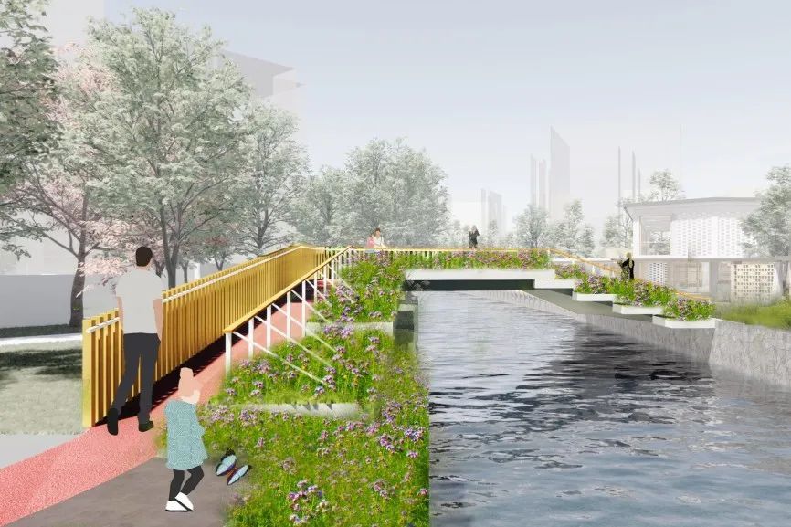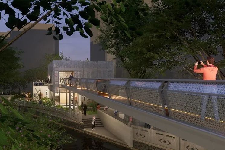 此外在环浜两岸,架设一条微微弯垂,下探水面的轻钢结构桥,名“触水桥”,增加桥梁的亲水性和人们的体验感。
